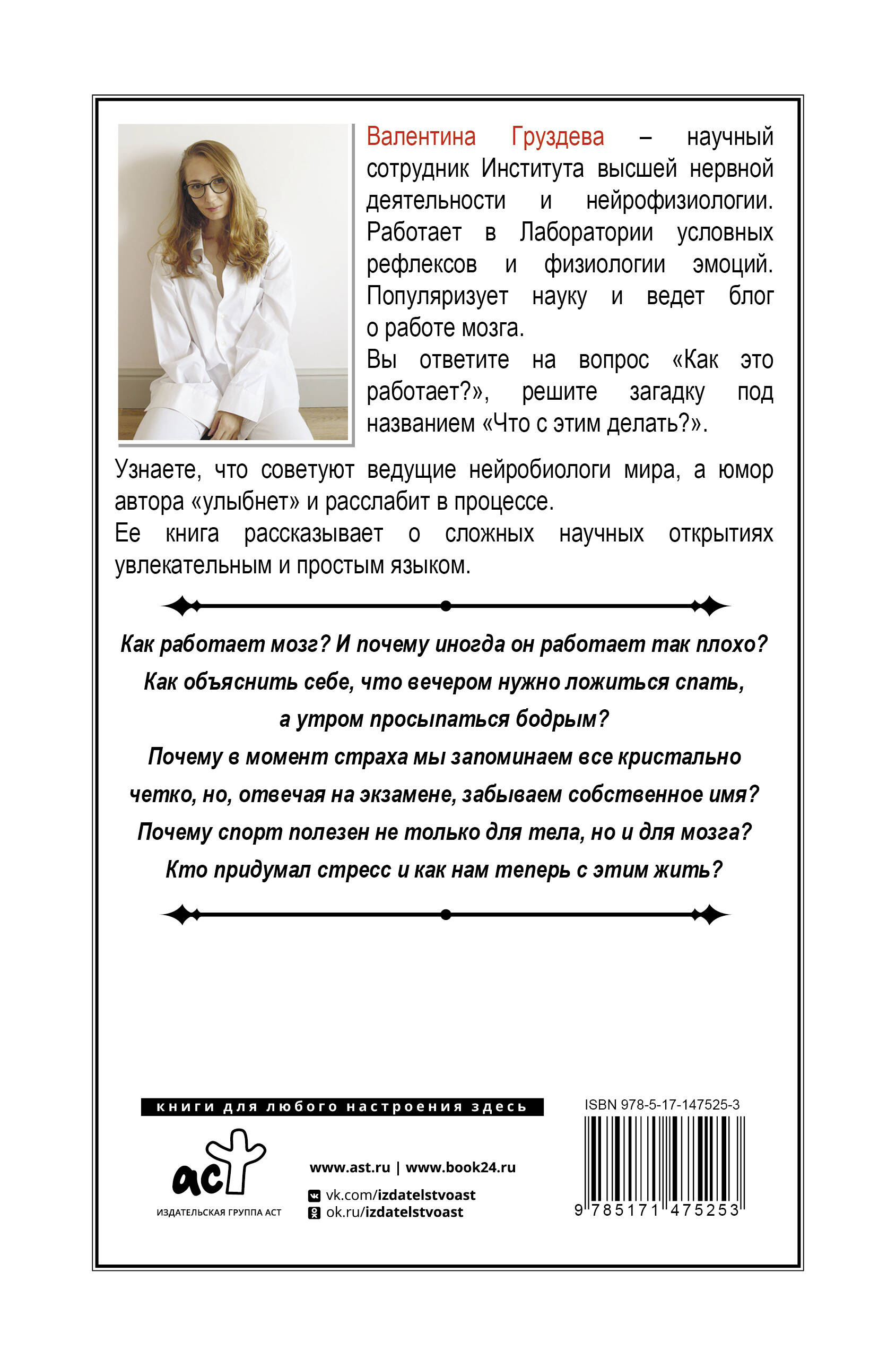 Валентина Груздева - научный сотрудник Института Высшей Нервной Деятельности И Нейрофизиологии. Работает в Лаборатории условных рефлексов и физиологии эмоций. Популяризует науку и ведет блог о работе мозга. Ее книга рассказывает о сложных научных открытиях увлекательным и простым языком. Как работает мозг? И почему иногда он работает так плохо? Как объяснить себе, что вечером нужно ложиться спать, а утром просыпаться бодрым? Почему в момент страха мы запоминаем все кристально четко, но отвечая на экзамене, забываем собственное имя? Почему спорт полезен не только для тела, но и для мозга? Кто придумал стресс и как нам теперь с этим жить? Вы ответите на вопрос «Как это работает?», решите загадку под названием «Что с этим делать?». Узнаете, что советуют ведущие нейробиологи мира, а юмор автора «улыбнет» и расслабит в процессе.| Издательство | ИЗДАТЕЛЬСТВО "АСТ" |