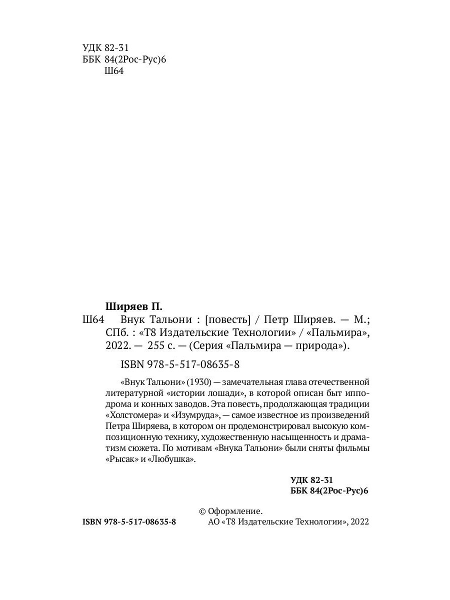 "Внук Тальони" (1930) - замечательная глава отечественной литературной "истории лошади", в которой описан быт ипподрома и конных заводов. Эта повесть, продолжающая традиции "Холстомера" и "Изумруда" - самое известное из произведений Петра Ширяева, в котором он достиг высокой композиционной техники, художественной насыщенности и драматизма. По мотивам "Внука Тальони" были сняты фильмы "Рысак" и "Любушка".