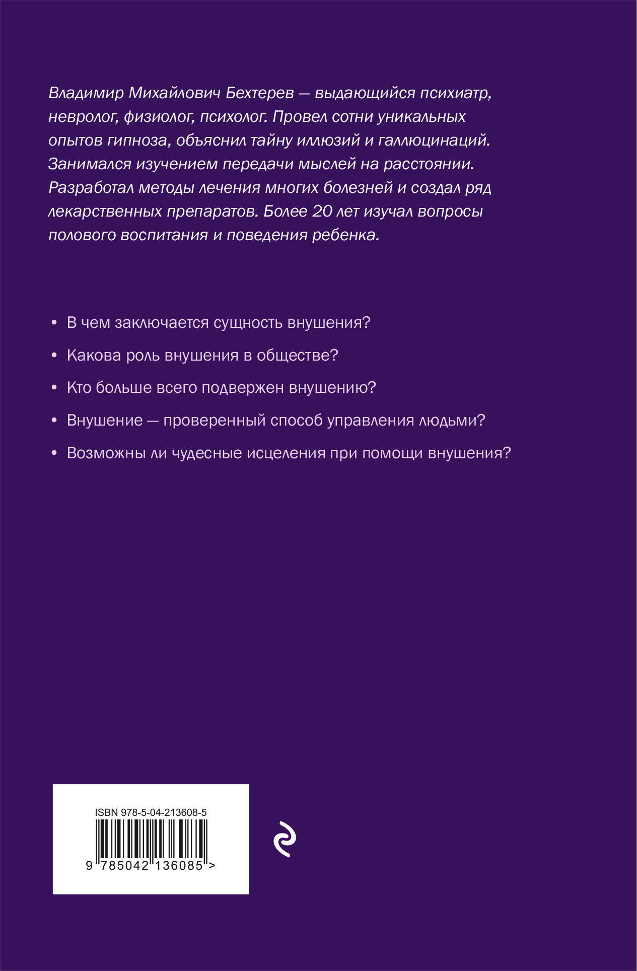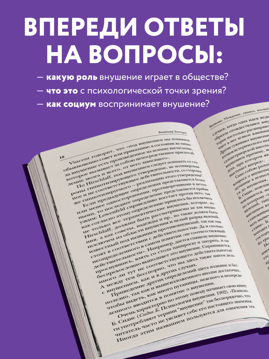 Владимир Михайлович Бехтерев - автор двух тысяч научных работ о внушении и гипнозе, об исследовании возникновения галлюцинаций, иллюзий, об изучении приемов обработки людей. «Внушение. Убеждение, гипноз, воспитание» - первый в отечественной науке опыт изучения внушения как феномена, его роли и механизмов в зарождении психических эпидемий и их распространения в периоды кризисных ситуаций в обществе. По мнению В. Бехтерева, внушение является тем социальным фактором, который играет немаловажную роль в жизни и истории целых народов. Книга для всех, кто интересуется вопросами психологии и социальной философии.
