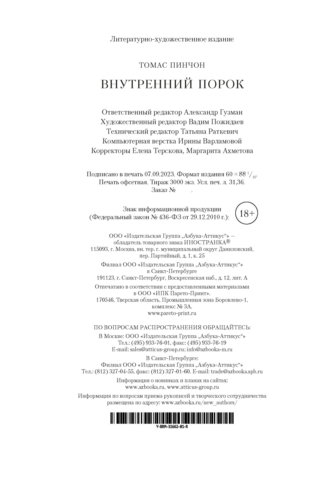 Томас Пинчон - наряду с Сэлинджером, «великий американский затворник», один из крупнейших писателей мировой литературы XX, а теперь и XXI века, после первых же публикаций единодушно признанный классиком уровня Набокова, Джойса и Борхеса. Герои Пинчона традиционно одержимы темами вселенского заговора и социальной паранойи, поиском тайных пружин истории. И кто бы мог подумать, что автор таких краеугольных камней постмодернизма, как «V.» и «Радуга тяготения», возьмется за детектив. Ну да Пинчон не был бы Пинчоном, если бы и здесь не изобрел свой собственный жанр - психоделический нуар. Его герой, частный детектив Док Спортелло, временами выплывая из дурманной дымки, наблюдает закат эпохи всеобщей любви и наступление века паранойи. А когда в его жизнь вдруг возвращается бывшая подруга по имени Шаста с историей о готовящемся похищении магната-застройщика Мики Волкманна, Док поневоле запутывается в хитрой паутине перекрестных интересов, неочевидных улик и ложных следов. И что такое вездесущий Золотой Клык - придуманная дантистами схема ухода от налогов, азиатский наркокартель или нечто куда более зловещее?.. В 2014 году Пол Томас Андерсон - один из главных визионеров современного кинематографа, постановщик таких картин, как «Ночи в стиле буги» и «Магнолия», «Нефть» и «Мастер», «Призрачная нить» и «Лакричная пицца», - бережно перенес «Внутренний порок» на большой экран; впервые в истории произведение Пинчона поддалось киноадаптации. В фильме, номинированном на два «Оскара», снимались Хоакин Феникс, Джош Бролин, Риз Уизерспун, Бенисио дель Торо, Джоанна Ньюсом и др. Перевод публикуется в новой редакции.| Издательство | Иностранка |