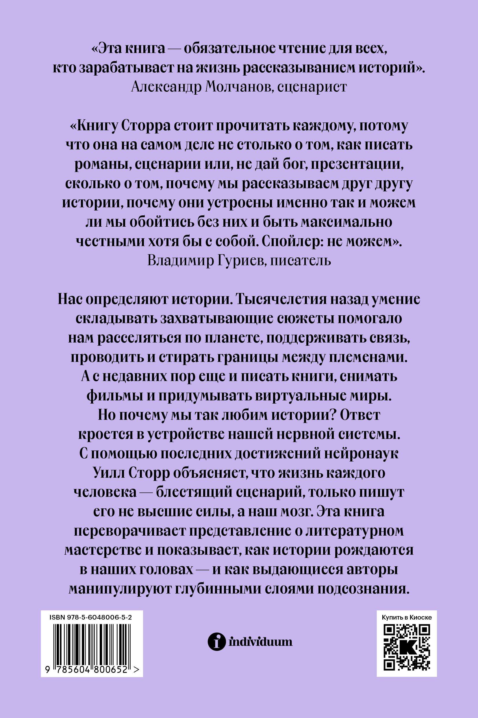Нас определяют истории. Они лежат в основе наших убеждений и верований, характеров и вкусов. Тысячелетия назад умение складывать захватывающие сюжеты помогало нам расселяться по планете, поддерживать связь, проводить и стирать границы между племенами. А с недавних пор еще и писать книги, снимать фильмы и придумывать виртуальные миры. Но почему мы так любим истории? Ответ кроется в устройстве нашего мозга. С помощью последних достижений нейронаук Уилл Сторр объясняет, что корни всемирной славы Шекспира лежат в эволюции, в чем сила «Гражданина Кейна» и «Красоты по-американски» и чему мы можем научиться у самих себя. По мнению Сторра, жизнь каждого человека - блестящий сценарий, только пишут его не высшие силы, а наш мозг, ежеминутно наполняя происходящее смыслом и предназначением. «Внутренний рассказчик» переворачивает представление о литературном мастерстве и навыках сценариста и показывает, как истории рождаются в наших головах - и как авторы киноблокбастеров и признанных литературных шедевров манипулируют глубинными слоями подсознания. Осторожно: спойлеры! В книге раскрывается сюжет «Короля Лира», «Гамлета», «Дороги перемен», «Лолиты», «Лоуренса Аравийского» и др.| Издательство | ИНДИВИДУУМ ПРИНТ ООО |