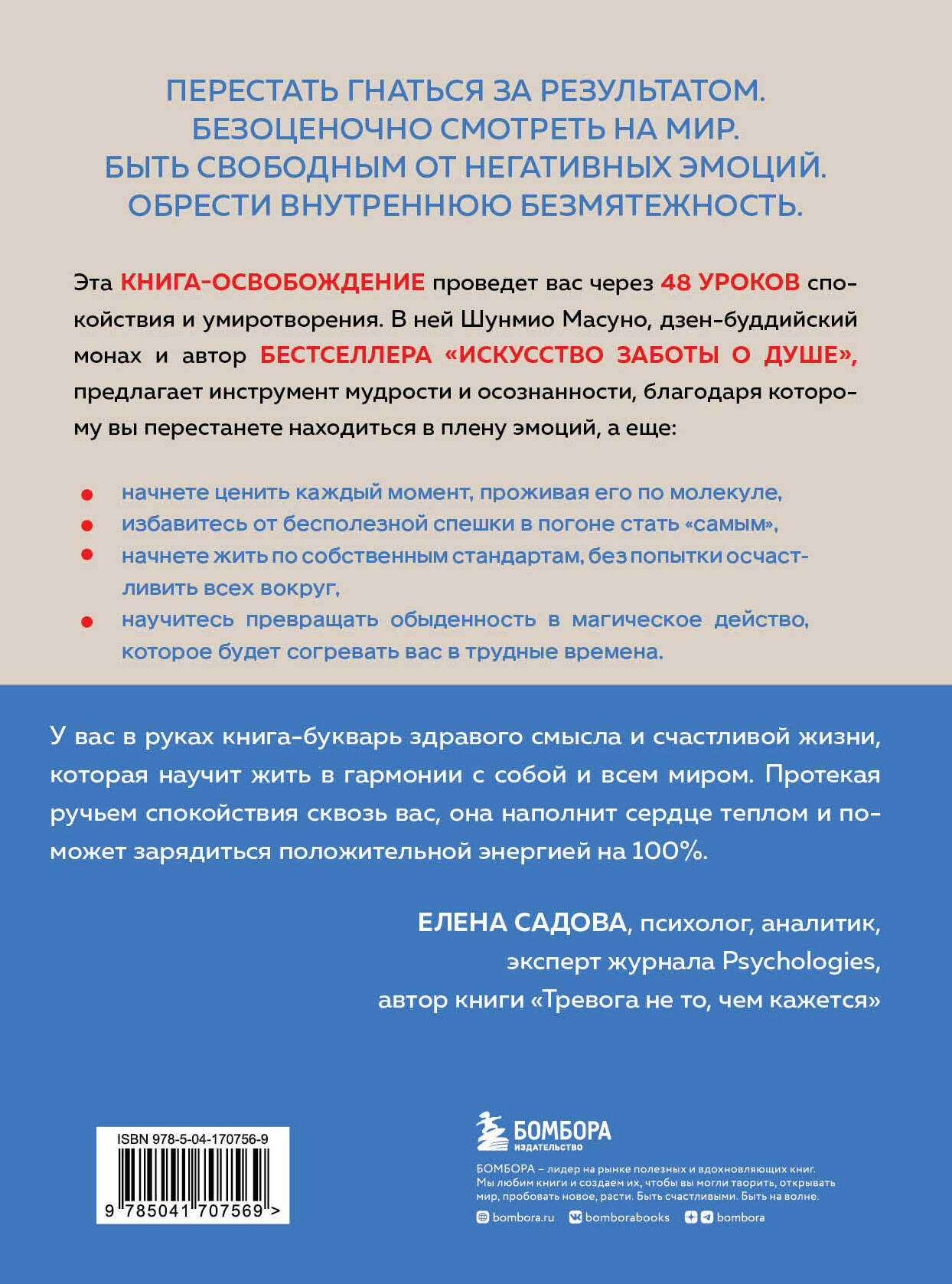 Перестать гнаться за результатом. Безоценочно смотреть на мир. Быть свободным от негативных эмоций. Обрести внутреннюю безмятежность. Эта книга-освобождение проведет вас через 48 уроков спокойствия и умиротворения. В ней Шунмио Мансуно, дзен-буддийский монах и автор бестселлера «Искусство заботы о душе», предлагает инструмент мудрости и осознанности, благодаря которому вы перестанете находится в плену эмоций, а еще: - начнете ценить каждый момент, проживая его по молекуле; - избавитесь от бесполезной спешки в погоне стать «самым»; - начнете жить по собственным стандартам, без попытки осчастливить всех вокруг; - научитесь превращать обыденность в магическое действо, которое будет согревать вас в трудные времена.| Издательство | ООО "Издательство "Эксмо" |