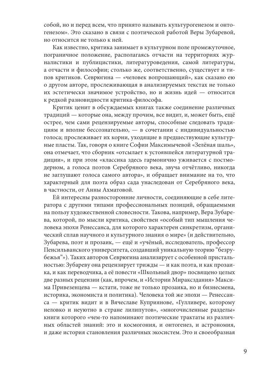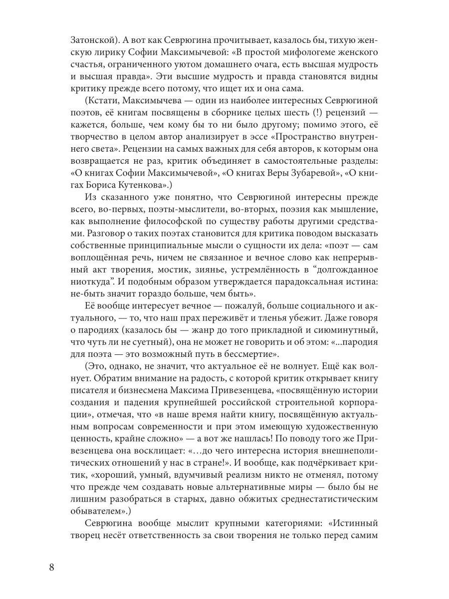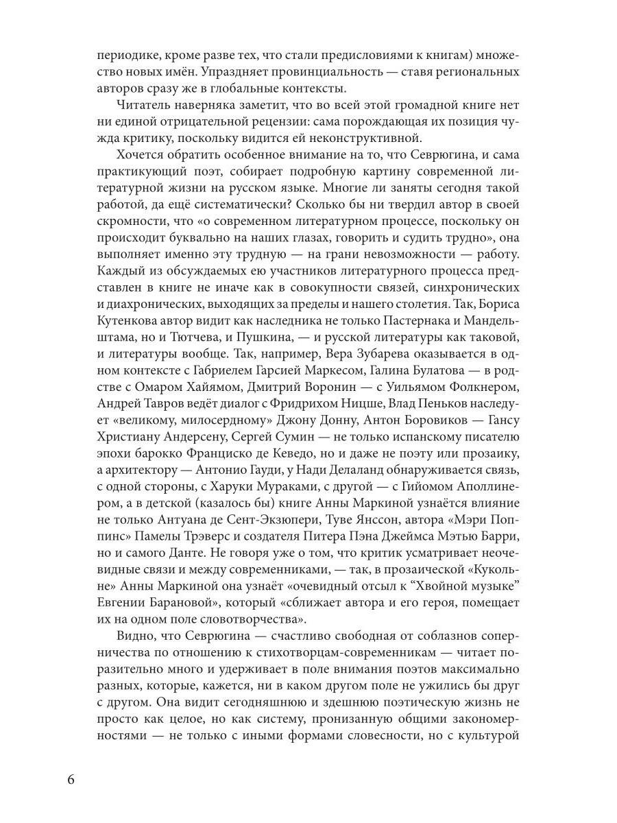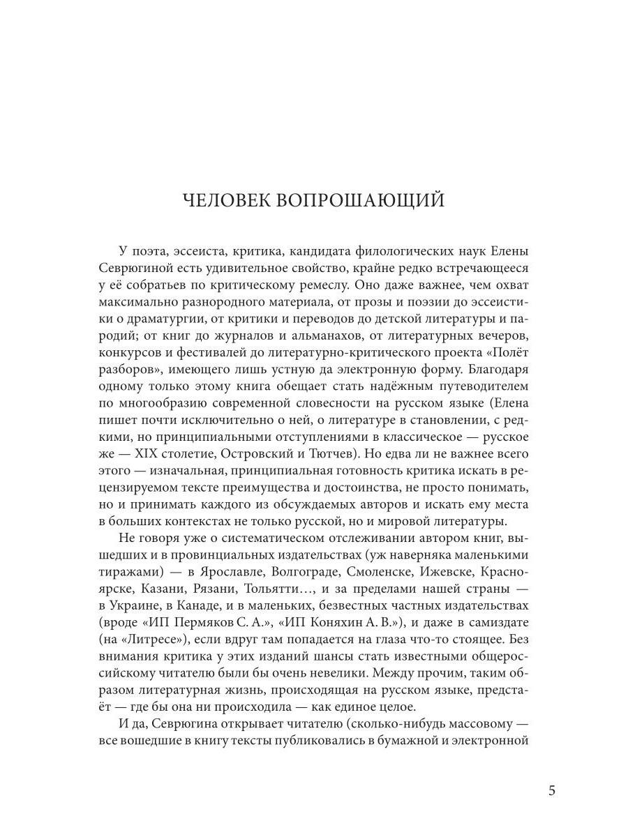 На протяжении нескольких лет Елена Севрюгина собирала свой путеводитель по миру современной литературы. Ее внимание привлекают самые разные тексты: поэзия и проза, критика и переводы, альманахи и журналы, драматургия и эссеистика - опубликованные в столичных, провинциальных, зарубежных издательствах и даже в самиздате. Понимая и принимая каждого автора, отмечая почти исключительно достоинства его текстов и авторский потенциал, Севрюгина ищет всем им место в контексте большой литературы, представляя ее как совокупность связей - временных, пространственных, национальных и более того - внелитературных.| Издательство | Т8 RUGRAM |