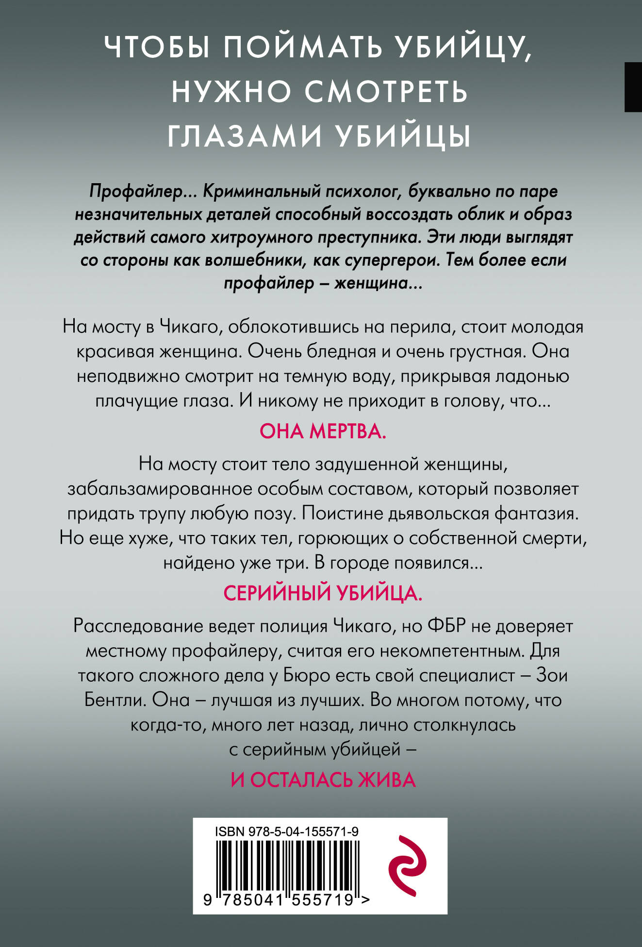 Чтобы поймать убийцу, нужно смотреть глазами убийцы. БЕСТСЕЛЛЕР NEW YORK TIMES, WASHINGTON POST И AMAZON CHARTS. Профайлер… Криминальный психолог, буквально по паре незначительных деталей способный воссоздать облик и образ действий самого хитроумного преступника. Эти люди выглядят со стороны как волшебники, как супергерои. Тем более если профайлер - женщина… Разум убийцы - это ее территория. Она вычисляет серийных убийц. Он вычисляет жертв. Рано или поздно они встретятся… На мосту в Чикаго, облокотившись на перила, стоит молодая красивая женщина. Очень бледная и очень грустная. Она неподвижно смотрит на темную воду, прикрывая ладонью плачущие глаза. И никому не приходит в голову, что… ОНА МЕРТВА. На мосту стоит тело задушенной женщины, забальзамированное особым составом, который позволяет придать трупу любую позу. Поистине дьявольская фантазия. Но еще хуже, что таких тел, горюющих о собственной смерти, найдено уже три. В городе появился… СЕРИЙНЫЙ УБИЙЦА. Расследование ведет полиция Чикаго, но ФБР не доверяет местному профайлеру, считая его некомпетентным. Для такого сложного дела у Бюро есть свой специалист - Зои Бентли. Она - лучшая из лучших. Во многом потому, что когда-то, много лет назад, лично столкнулась с серийным убийцей - И ОСТАЛАСЬ ЖИВА…| Издательство | ООО "Издательство "Эксмо" |