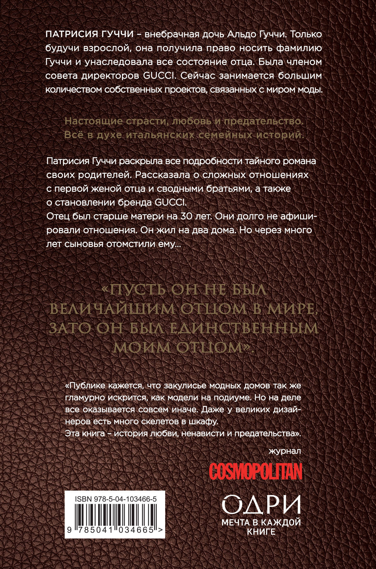 Настоящие эмоции и страсти, любовь и предательство. Всё в духе итальянских семейных историй. Патрисия Гуччи раскрыла все подробности тайного романа своих родителей. Рассказала о сложных отношениях с первой женой отца и сводными братьями, а также о становлении бренда GUCCI. «Пусть он не был величайшим отцом в мире, зато он был единственным моим отцом», - пишет автор. О чем эта книга Отец был старше матери на 30 лет. Они долго не афишировали отношения. Он жил на два дома. Но через много лет сыновья отомстили ему, сделав всё, чтобы Альдо попал в тюрьму. Но он выдержал этот удар судьбы и после смерти оставил все свое состояние единственной дочери, лишив наследства предавших его сыновей. Для кого эта книга - для тех, у любит формат мемуаров и TRUE STORY; - для всех любителей моды. Фишки книги - большое количество редких, семейных фотографий; - в книге цитируются любовные письма Альдо Гуччи и матери автора Бруны Паломбо; - в мемуарах упоминаются имена и рассказывается о встречах с такими людьми, как Грейс Келли, Лучано Паваротти, Кэри Грант, Грегори Пек, Нэнси Рейган, принц Чарльз. - эта часть семейной саги оставалась неизвестной. Более того, все попытки снять полнометражный фильм о семье Гуччи натыкались на сопротивление нынешних представителей династии, которые так и не дали на это разрешения; - в книге много итальянских фраз и выражений, что несомненно придает колорит. Об авторе Патрисия Гуччи, внебрачная дочь Альдо Гуччи, уже во взрослом возрасте получившая право носить его фамилию и унаследовавшая все его состояние. Была членом совета директоров Gucci, занимается большим количеством собственных разнообразных проектов, связанных с миром моды. Отзыв «Публике кажется, что закулисье модных домов так же гламурно искрится, как модели на подиуме. Но на деле все оказывается совсем иначе. Даже у великих дизайнеров есть много скелетов в шкафу. Эта книга - по-итальянски яркая история любви, ненависти и предательства». - Журнал COSMOPOLITAN| Издательство | ООО "Издательство "Эксмо" |
