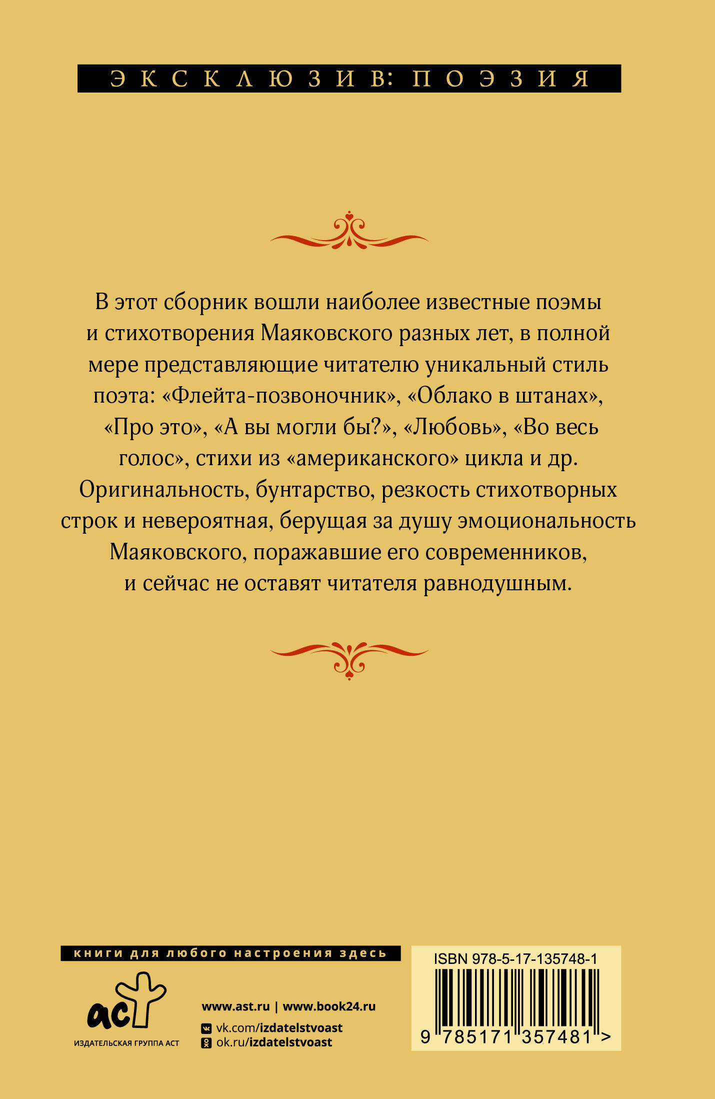 В этот сборник вошли наиболее известные поэмы и стихотворения Маяковского разных лет, в полной мере представляющие читателю уникальный стиль поэта: "Флейта-позвоночник", "Облако в штанах", "Про это", "А вы могли бы?", "Любовь", "Во весь голос", стихи из "американского" цикла и др. Оригинальность, бунтарство, резкость стихотворных строк и невероятная, берущая за душу эмоциональность Маяковского, поражавшие его современников, и сейчас не оставят читателя равнодушным.| Издательство | ИЗДАТЕЛЬСТВО "АСТ" |