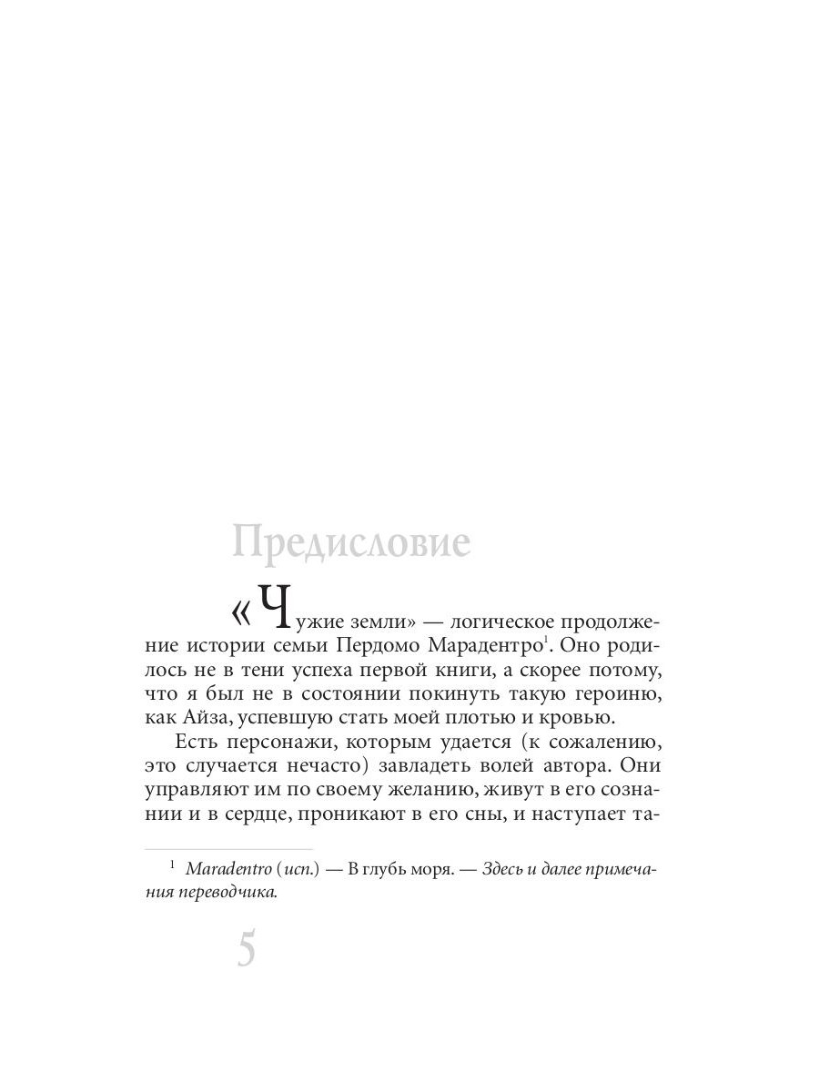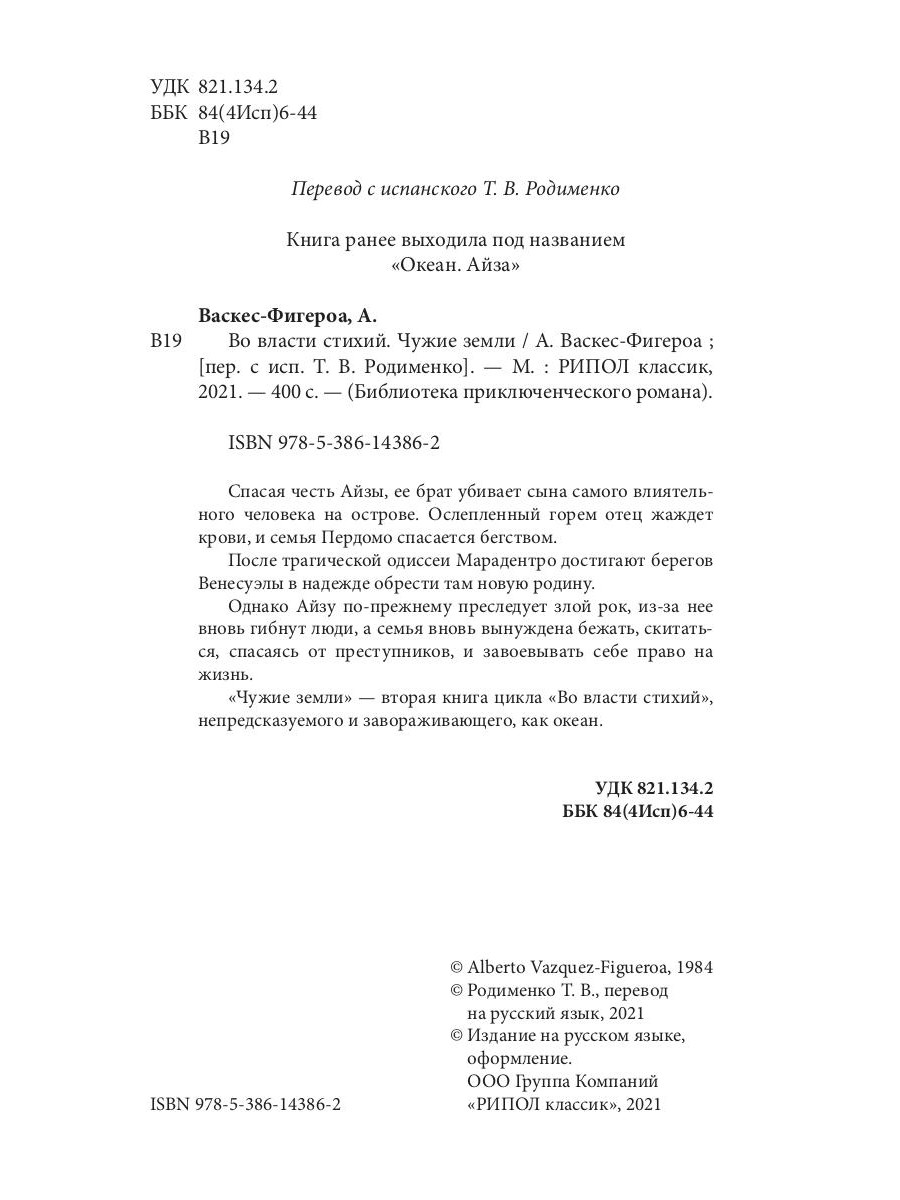 Спасая честь Айзы, ее брат убивает сына самого влиятельного человека на острове. Ослепленный горем отец жаждет крови, и семья Пердомо спасается бегством. После трагической одиссеи Марадентро достигают берегов Венесуэлы в надежде обрести там новую родину. Однако Айзу по-прежнему преследует злой рок, из-за нее вновь гибнут люди, а семья вновь вынуждена бежать, скитаться, спасаясь от преступников, и завоевывать себе право на жизнь. «Чужие земли» - вторая книга цикла «Во власти стихий», непредсказуемого и завораживающего, как океан.| Издательство | Рипол Классик |