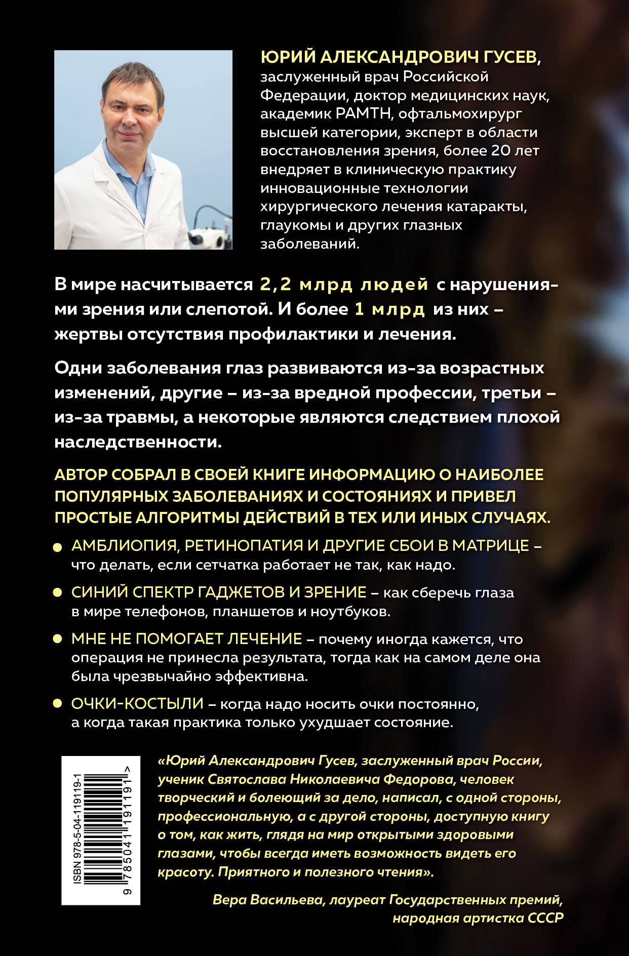 О самом дорогом говорят: «Береги, как зеницу ока!». Болезни глаза в большинстве случаев не влияют напрямую на продолжительность жизни, но очень сильно влияют на ее качество. В мире сейчас около 2,2 миллиардов людей с нарушением зрения или слепотой. Более миллиарда из них - это жертвы отсутствия профилактики и лечения! То есть, каждый четвертый житель планеты не видит или видит плохо, просто потому, что вовремя не пришел к врачу! Книга известного отечественного офтальмолога доктора Гусева поможет вам оценить состояние своего зрения и принять своевременные меры для его сохранения или восстановления в любом возрасте.| Издательство | ООО "Издательство "Эксмо" |