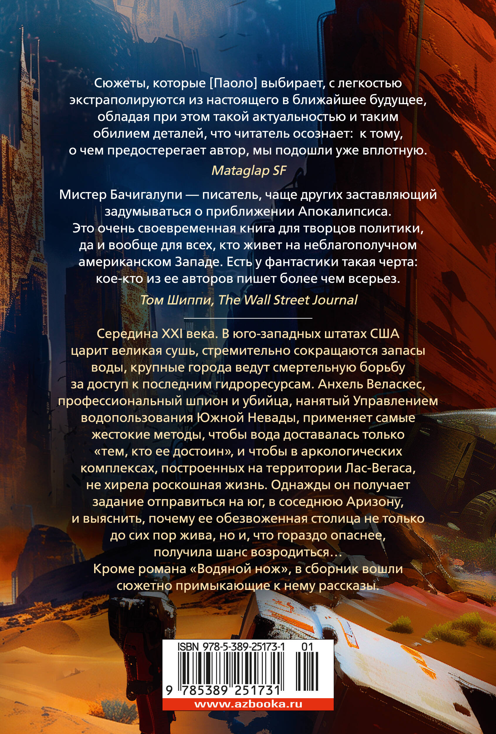 Середина XXI века. В юго-западных штатах США царит великая сушь, стремительно сокращаются запасы воды, крупные города ведут смертельную борьбу за доступ к последним гидроресурсам. Анхель Веласкес, профессиональный шпион и убийца, нанятый Управлением водопользования Южной Невады, применяет самые жестокие методы, чтобы вода доставалась только "тем, кто ее достоин", и чтобы в аркологических комплексах, построенных на территории Лас-Вегаса, не хирела роскошная жизнь. Однажды он получает задание отправиться на юг, в соседнюю Аризону, и выяснить, почему ее обезвоженная столица не только до сих пор жива, но и, что гораздо опаснее, получила шанс возродиться… Кроме романа "Водяной нож", в сборник вошли сюжетно примыкающие к нему рассказы.| Издательство | Азбука-Аттикус Издат.группа ООО |