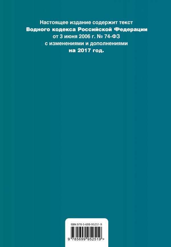 Издание содержит текст Водного кодекса Российской Федерации от 3 июня 2006 г. № 74-ФЗ с изменениями и дополнениями на 2017 год. Если есть изменения, вступающие в силу позднее, то вместе с редакцией нормы, действующей на эту дату, приводится норма в новой редакции и указывается дата, с которой она вступает в силу.| Серия | Актуальное законодательство (обложка) |