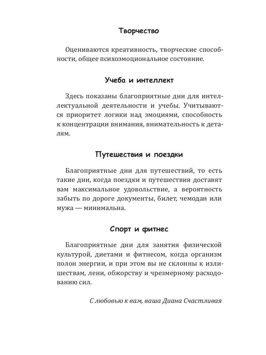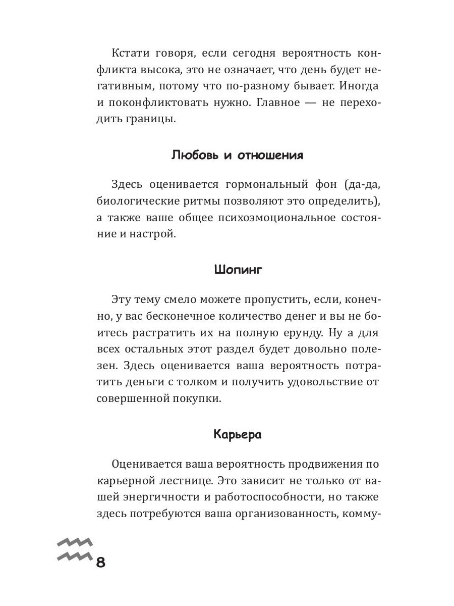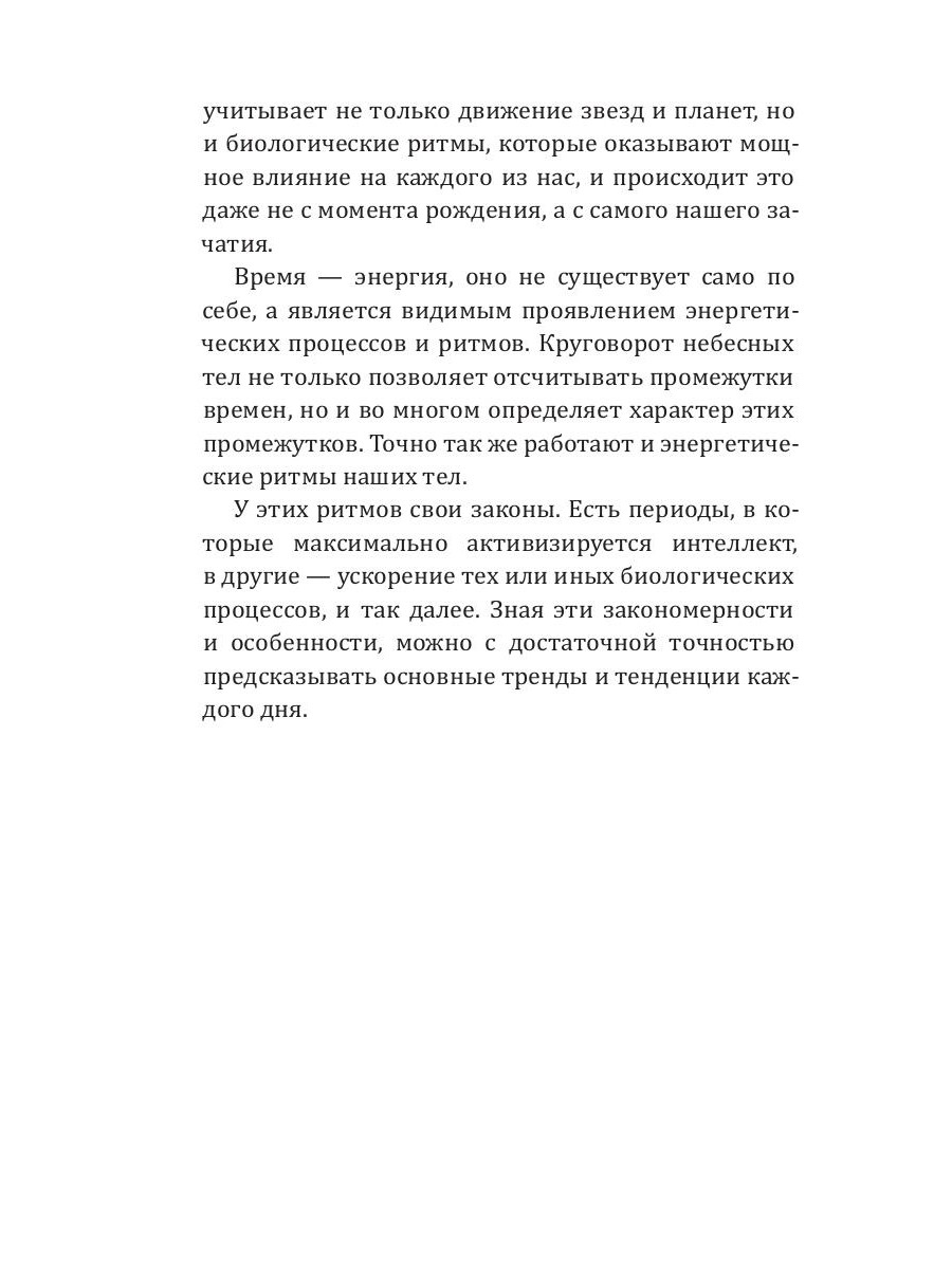 В этой книге вам будет предложен уникальный подход к интерпретации гороскопов, основанный на методике известного российского астролога Дмитрия Зимы. Гороскопы здесь рассматриваются не как предсказание событий, а как отражение тенденций, похожих на прогноз погоды. В каждом дне подробно раскрываются основные тренды, влияющие на любовь, карьеру, здоровье и финансы. Книга предлагает читателю возможность понять и использовать астрологические и биологические ритмы для повышения благоприятности своего дня. Основное внимание уделяется тому, как циклы небесных тел взаимодействуют с энергетическими ритмами человека, создавая уникальные возможности для роста и развития. Понимание этих закономерностей поможет вам не только предсказывать влияние времени на вашу жизнь, но и использовать его в своих интересах, извлекая максимальную пользу из каждого дня.| Издательство | Рипол Классик |
