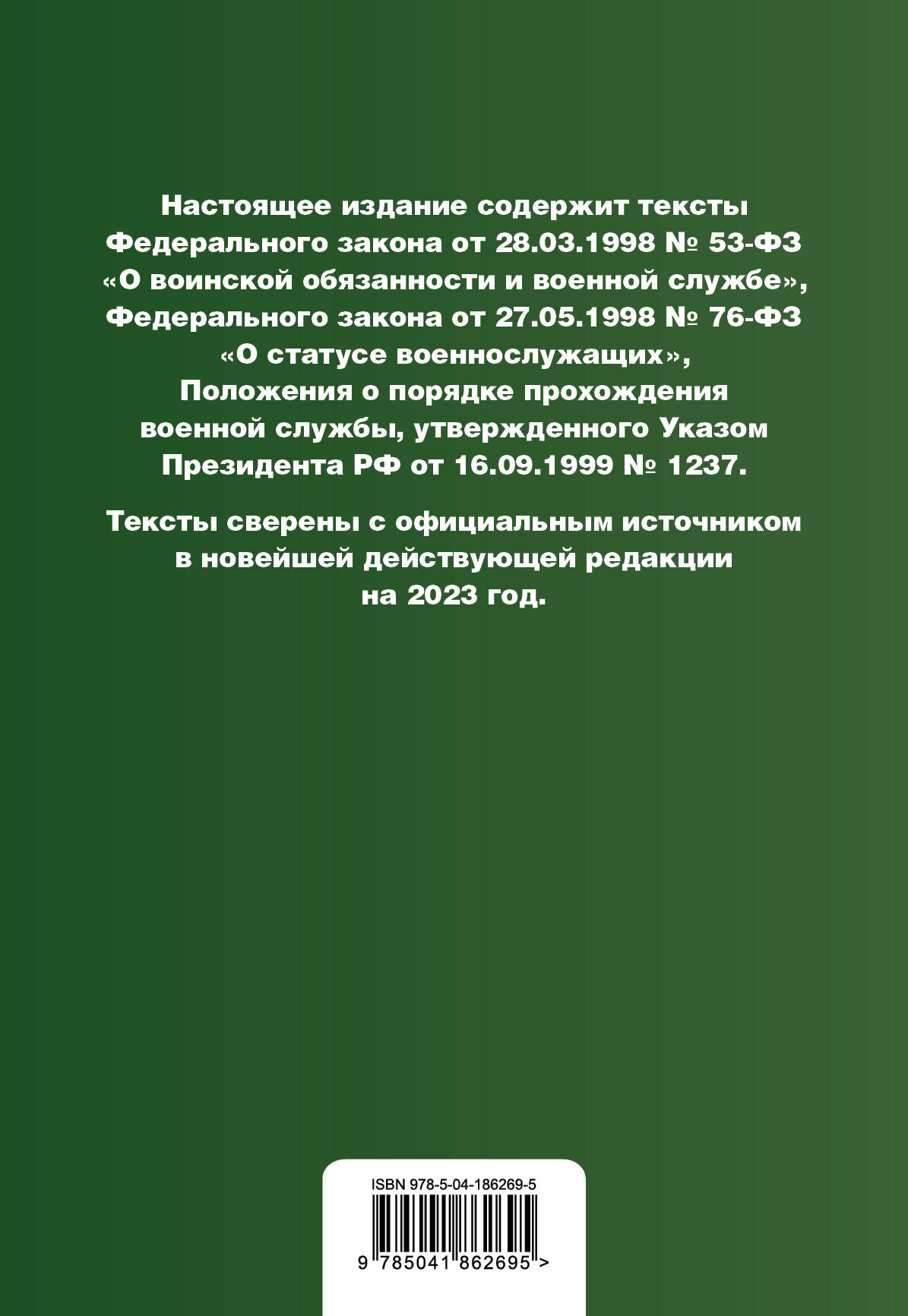 Впервые - в одном сборнике все тексты основных нормативных правовых актов, регулирующих вопросы военной службы в Российской Федерации в новейшей действущей редакции на 2023 год (с учетом поправок о добровольческих формированиях). В сборник включены тексты федеральных законов от 28.03.1998 № 53-ФЗ "О воинской обязанности и военной службе" и от 27.05.1998 № 76-ФЗ "О статусе военнослужащих", Положения о порядке прохождения военной службы, утвержденного Указом Президента РФ от 16.09.1999 № 1237.| Издательство | ООО "Издательство "Эксмо" |