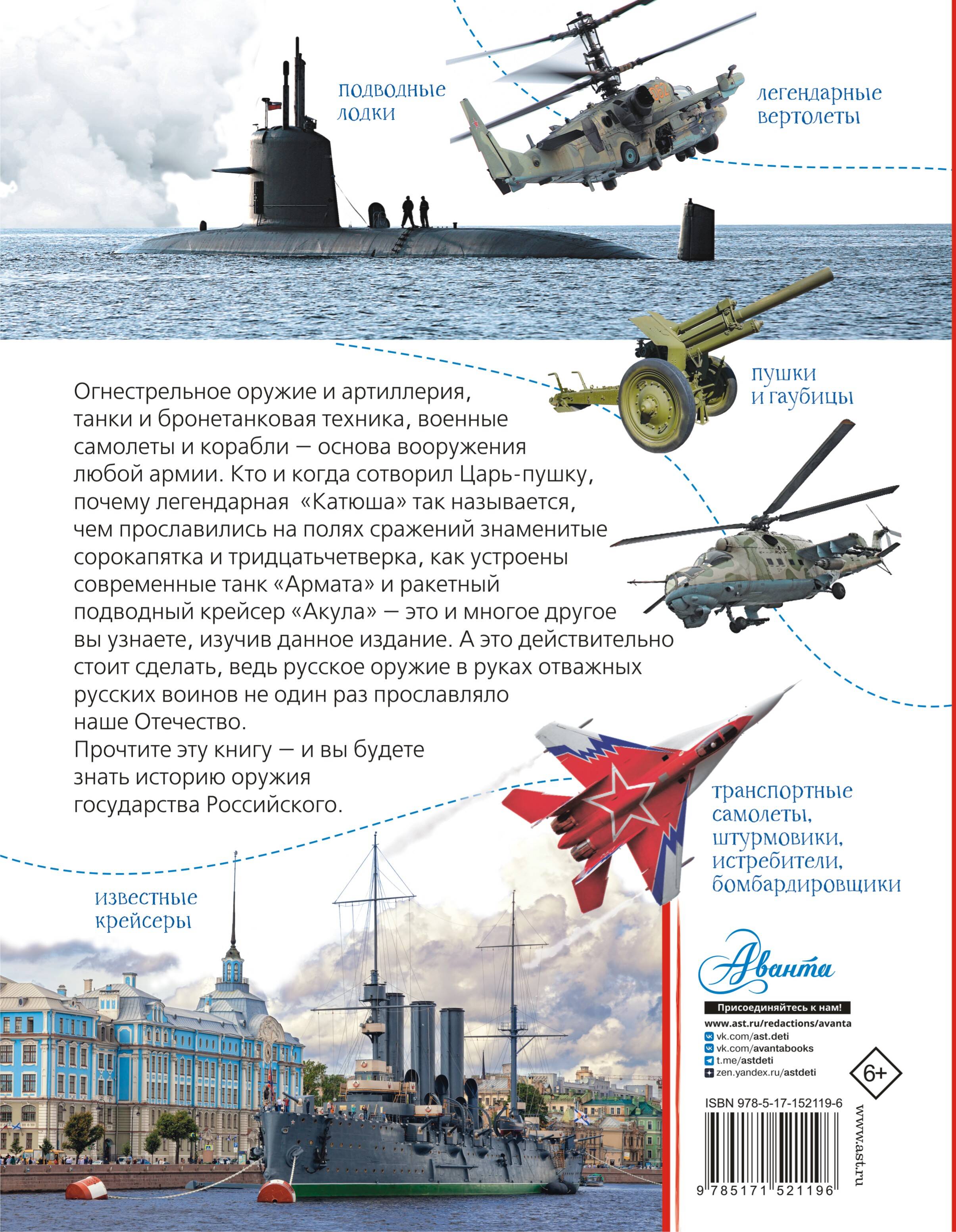 Российское государство существует и развивается уже много столетий благодаря, кроме всего прочего, и своей военной мощи. Не зря еще Александр III сказал: "Во всем свете у нас только два верных союзника - наша армия и флот". Наша книга посвящена описанию боевой техники России. Здесь представлены образцы оружия, применявшегося еще в древности, затем в советский период во время Великой Отечественной войны, а также новейшее вооружение армии современной России. Для среднего и старшего школьного возраста| Издательство | ИЗДАТЕЛЬСТВО "АСТ" |