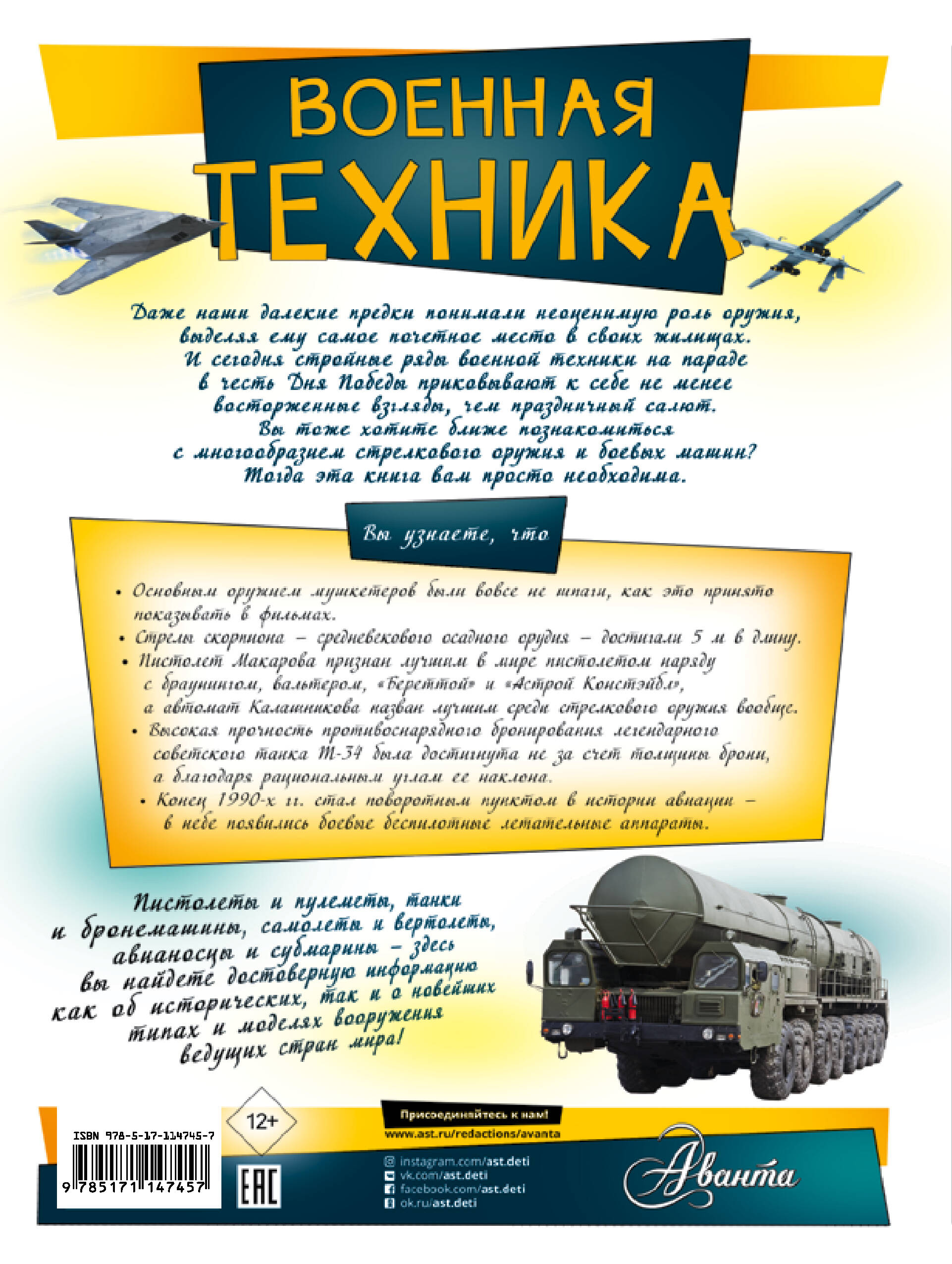 Даже наши далекие предки понимали неоценимую роль оружия, выделяя ему почетное место в своих жзилищах. И сегодня стройные ряды военной техники на параде в честь Дня Победы приковывают к себе не менее восторженные взгляды, чем праздничный салют. Вы тоже хотите ближе познакомиться с многообразием стрелкового оружия и боевых машин? Тогда эта книга вам просто необходима. Вы узнаете, что Основным оружием мушкетеров были вовсе не шпаги, как это принято показывать в фильмах. Стрелы скорпиона - средневекового осадного оружия - достигали 5 м в длину. Пистолет Макарова признан лучшим в мире пистолетом наряду с браунингом, вальтером, "Береттой" и "Астрой Констейбл", а автомат Калашникова назван лучшим среди стрелкового оружия вообще. Высокая прочность противоснарядного бронирования легендарного советского танка Т-34 была достигнута не за счет толщины брони, а благодаря рациональным углам ее наклона. Конец 1990-х гг. стал поворотным пунктом в истории авиации - в небе появились боевые беспилотные летательные аппараты. Пистолеты и пулеметы, танки и бронемашины, самолеты и вертолеты, авианосцы и субмарины - здесь вы найдете достоверную информацию как об исторических, так и о новейших типах и моделях вооружения ведущих стран мира!| Издательство | Издательство "АСТ" |