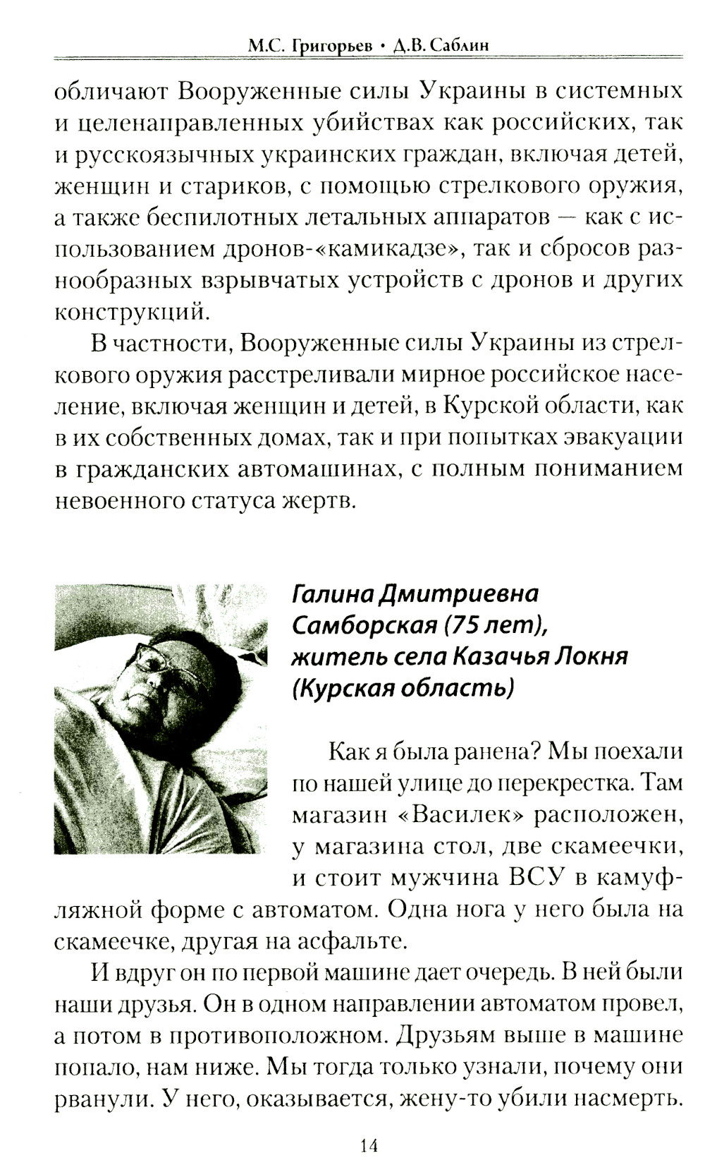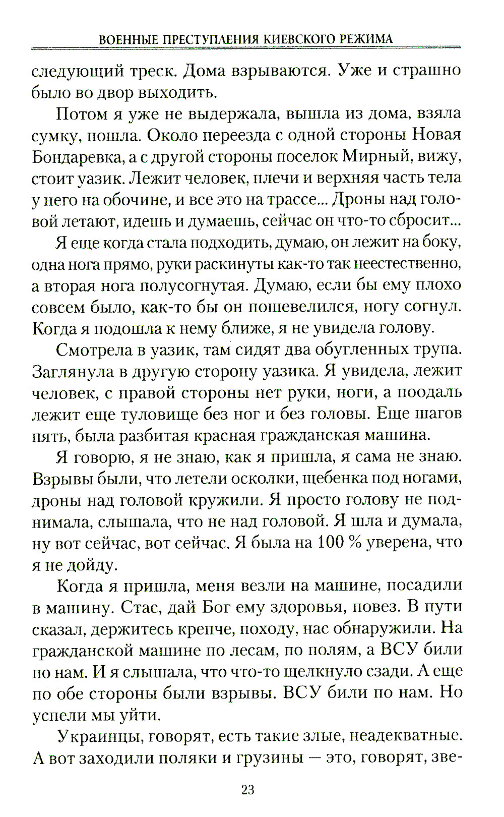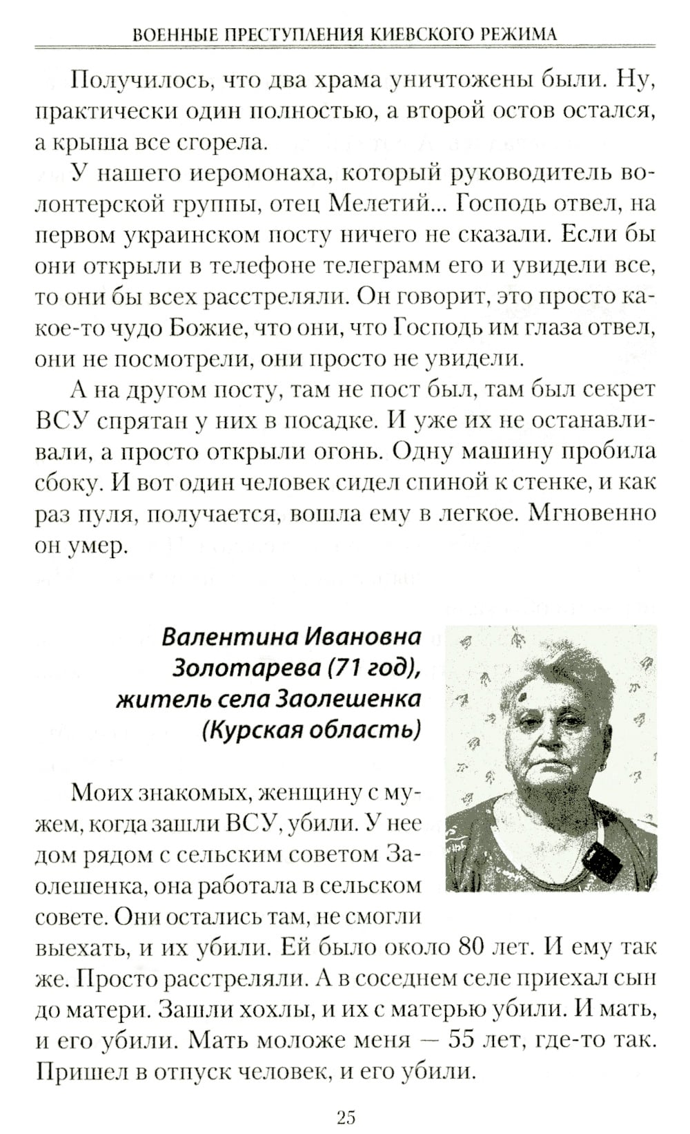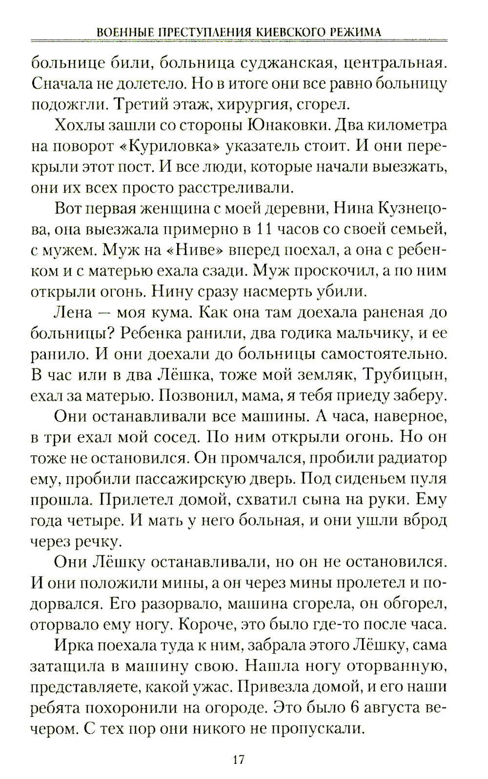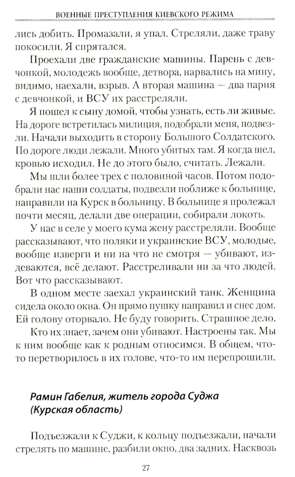 В этом издании представлены собранные Международным общественным трибуналом по преступлениям украинских неонацистов непосредственные свидетельства пострадавших от Вооруженных сил Украины. В Курской области ВСУ расстреливали мирное население, включая женщин, детей и стариков, как в их собственных домах, так и при попытках эвакуации в гражданских автомашинах с полным пониманием невоенного статуса жертв, наносили удары по больницам и церквям. На временно подконтрольной Украине территории русскоязычное население с 2014 года подвергалось постоянному террору. Показания свидетелей обличают украинскую власть в убийствах, пытках, избиениях, изнасилованиях, исчезновении людей и прицельных обстрелах их домов. ВСУ открыто говорили о своей ненависти к русскоязычному населению Донбасса, а угрозы убийств и расстрелов мирного населения были постоянной практикой киевского режима. Представленные в издании факты являются доказательствами военных преступлений, которые не имеют срока давности.| Издательство | Вече |
