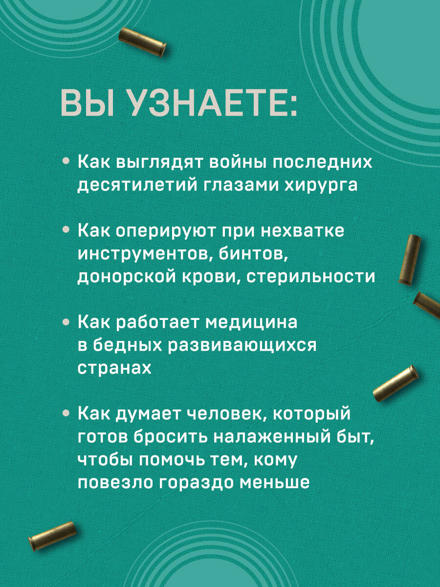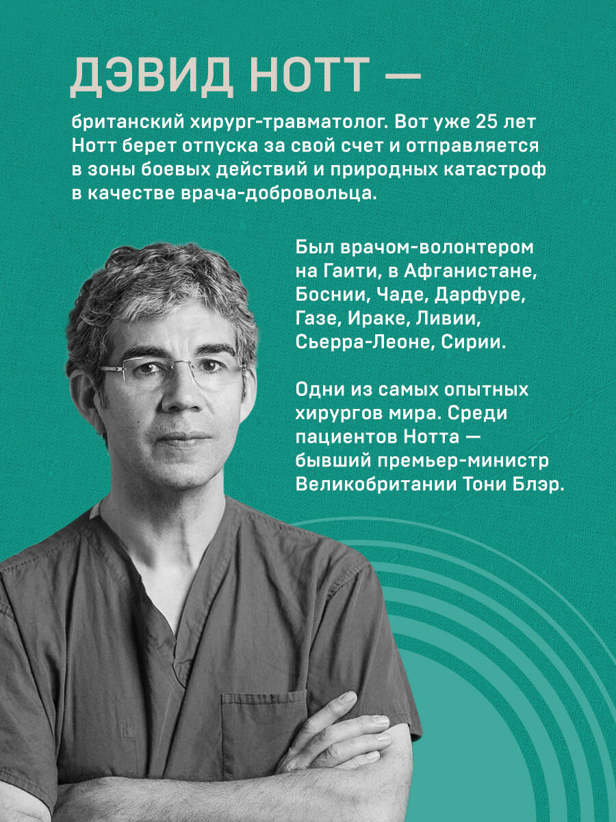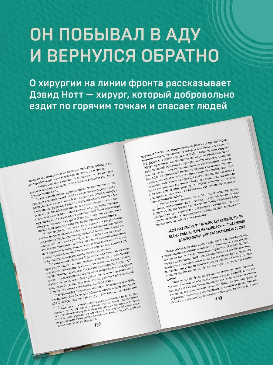 ОН ПОБЫВАЛ В АДУ И ВЕРНУЛСЯ ОБРАТНО! ДЭВИД НОТТ - хирург, специализирующийся на общей и сосудистой хирургии. Большую часть времени он работает в лондонских больницах, но на протяжении 25-ти лет периодически берет неоплачиваемые отпуска и отправляется в зоны боевых действий и природных катастроф в качестве врача-добровольца. Ему довелось побывать волонтером в Афганистане, Боснии, Чаде, Дарфуре, Газе, Ираке, Ливии, Сьерра-Леоне и на занятых оппозиционными силами территориях Сирии, а также на Гаити. Сегодня Дэвид Нотт считается одним из самых опытных хирургов мира. Среди его пациентов - бывший премьер-министр Великобритании Тони Блэр. «Храбрый, сострадательный и вдохновляющий - он заставил меня плакать». - АДАМ КЕЙ, автор мирового бестселлера «Будет больно: история врача, ушедшего из профессии на пике карьеры» «В настолько экстремальных обстоятельствах, в отличие от Дэвида Нотта, большинству из нас оказаться никогда не придется - к счастью! Но понимать, каково это - спасать людей на передовой, из-под завалов, от самодельных бомб - необходимо. Жизненно необходимо». - АЛЕКСАНДР АКУЛИНИЧЕВ, главный редактор ЗДОРОВЬЕ MAIL.RU «Очень серьезный труд, который максимально подробно описывает гуманитарную миссию организаций вроде "Врачи без границ" или "Международный комитет Красного Креста", рассказанную от лица непосредственного участника. Эту книгу важно прочитать всем, потому что там детально раскрыты ужасы, происходившие в театрах военных действий за последнюю декаду и даже ранее: все то, что мы просто видим в новостях и не осознаем до конца, насколько это плохо и бесчеловечно. Сараево, Афганистан, Сирия, Ливия, Ирак, вооруженные конфликты в Азии и Африке - похоже, автор побывал практически везде и везде пытался спасать людей. Когда читаешь такое произведение, то с ужасом осознаешь, что мир полон радикальных экстремистов, что миллионы людей до сих пор гибнут в мучениях из-за политических игр, что адекватную медицину во многие места мира приходится буквально доставлять отдельными бригадами, иначе люди попросту поубивают друг друга без малейшего шанса на спасение. Стоит отметить, что большая часть произведения идет в достаточно безэмоциональном и холодном, типичном для хирургов, повествовании. Это приятно, потому что не навязывает авторское отношение к ситуациям и дает возможность самостоятельно прочувствовать и оценить происходящее. Медицины описано не так много, и это точно хорошо для неподготовленного читателя. Да, встречаются ампутации, много разъяснений по физиологии и технике хирургии - пытливому уму это будет интересно. Есть и классные казуистические случаи, вроде запроса о технике проведения операции по СМС - как бы абсурдно это ни звучало, но это помогло сохранить очередную жизнь. Несмотря на практически полную нейтральность книги в плане политики, кроме дальнейших попыток осветить все ужасы в Сирии в международных СМИ, там можно усмотреть намеки на чисто английский юмор: "Почувствовав облегчение, я занялся водителем "Скорой" и, выпив кружку горячего сладкого чая, прооперировал его - с момента, как его подстрелили, не прошло и часа". Совершенно прекрасное произведение, которое я буду рекомендовать прочитать любому человеку, в первую очередь не-медику. Оно про ту тяжелую часть жизни, которую мы обычно не видим, а лишь пытаемся пред