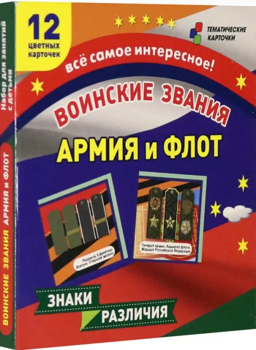 Тематические карточки "Воинские звания. Армия и флот" познакомят обучающихся с военными чинами и званиями в Российской армии. В набор входит комплект из 12 карточек; на лицевой стороне карточки - сюжетные картинки с изображением погон и знаками отличия военных; на обороте - описание и назначение званий военнослужащих Российской армии и флота. Пособие направлено на развитие познавательного интереса; будет полезно при обучении основам военной подготовки на уроках ОБЖ. Комплект предназначен педагогам ОБЖ и обучающимся.