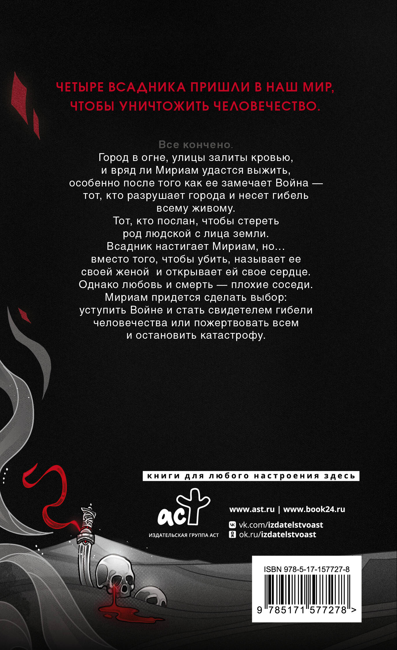 Четыре Всадника пришли в наш мир, чтобы уничтожить человечество. Вслед за Мором, явился его брат - Война. Все кончено. Город в огне, улицы залиты кровью, и вряд ли Мириам удастся выжить, особенно после того как ее замечает Война - тот, кто разрушает города и несет гибель всему живому. Тот, кто послан, чтобы стереть род людской с лица земли. Всадник настигает Мириам, но… вместо того, чтобы убить, называет ее своей женой и открывает ей свое сердце. Однако любовь и смерть - плохие соседи. Мириам придется сделать выбор: уступить Войне и стать свидетелем гибели человечества, или пожертвовать всем и остановить катастрофу.| Издательство | ИЗДАТЕЛЬСТВО "АСТ" |