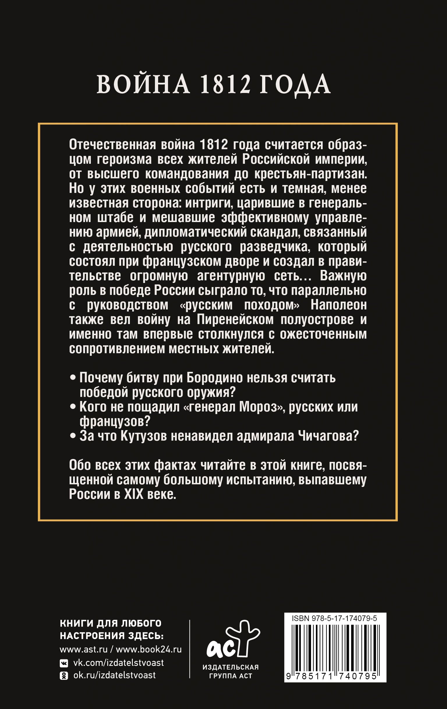 Отечественная война 1812 года считается образцом героизма всех жителей Российской империи, от высшего командования до крестьян-партизан. Но у этих событий есть и темная, менее известная сторона: интриги, царившие в генеральном штабе и мешавшие эффективному управлению армией, дипломатический скандал, связанный с деятельностью русского разведчика, который состоял при французскому дворе и создал в правительстве огромную агентурную сеть… Важную роль в победе России сыграло то, что параллельно с руководством "русским походом" Наполеон также вел войну на Пиренейском полуострове и именно там впервые столкнулся с ожесточенным сопротивлением местных жителей. Почему битву при Бородино нельзя считать победой русского оружия? Кого не пощадил "генерал Мороз", русских или французов? За что Кутузов ненавидел адмирала Чичагова? Обо всех этих фактах читайте в нашем новом издании, посвященном самому большому испытанию, выпавшему России в XIX веке.| Издательство | Издательство "АСТ" |