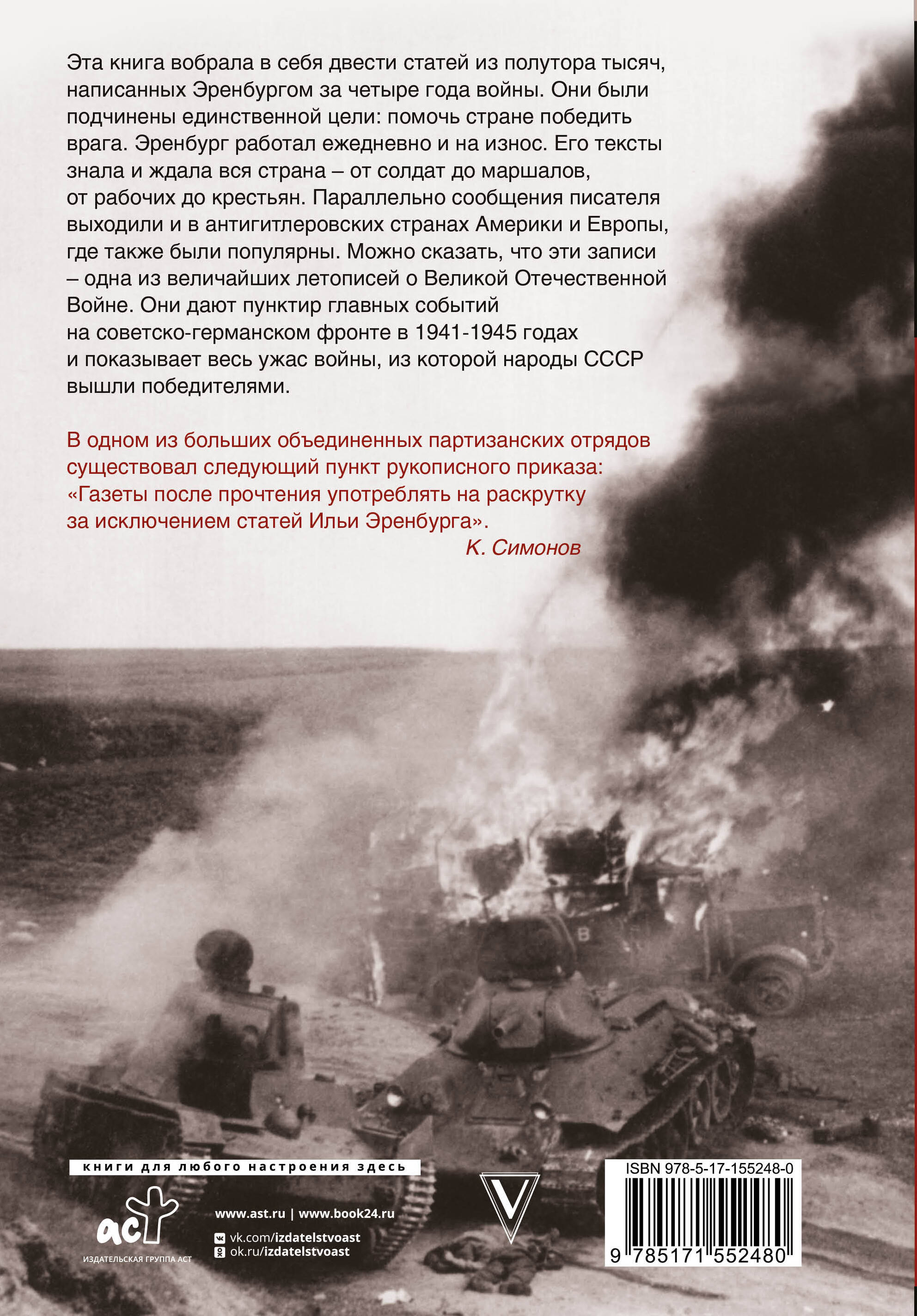 Эта книга вобрала в себя двести статей из полутора тысяч, написанных Эренбургом за четыре года войны. Они были подчинены единственной цели: помочь стране победить врага. Эренбург работал ежедневно и на износ. Его тексты знала и ждала вся страна - от солдат до маршалов, от рабочих до крестьян. Параллельно сообщения писателя выходили и в антигитлеровских странах Америки и Европы, где также были популярны. Можно сказать, что эти записи - одна из величайших летописей о Великой Отечественной Войне. Они дают пунктир главных событий на советско-германском фронте в 1941-1945 годах и показывает весь ужас войны, из которой народы СССР вышли победителями. В одном из больших объединенных партизанских отрядов существовал следующий пункт рукописного приказа: "Газеты после прочтения употреблять на раскрутку за исключением статей Ильи Эренбурга". К. Симонов| Издательство | ИЗДАТЕЛЬСТВО "АСТ" |