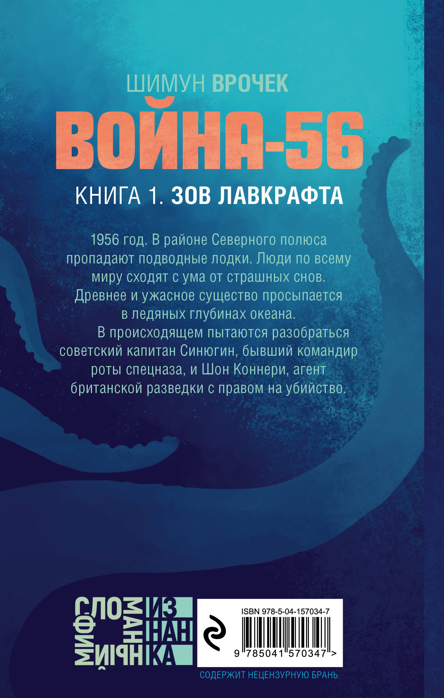 1956 год. В районе Северного полюса пропадают подводные лодки. Люди по всему миру сходят с ума от страшных снов. Древнее и ужасное существо просыпается в ледяных глубинах океана. В происходящем пытаются разобраться советский капитан Синюгин, бывший командир роты спецназа, и Шон Коннери, агент британской разведки с правом на убийство. Новый роман писателя-фантаста Шимуна Врочека, сочетающий в себе элементы альтернативной истории, боевика и хоррора. «Война-56. Зов Лавкрафта» - первая книга цикла. Конец света в натуральную величину, или когда атомная бомба - наш единственный шанс на выживание. Книгу оценят по достоинству любители творчества таких авторов, как Том Клэнси, Г.Ф. Лавкрафт и Юлиан Семенов. Лавкрафт прав - Ктулху существует.| Издательство | Эксмо |