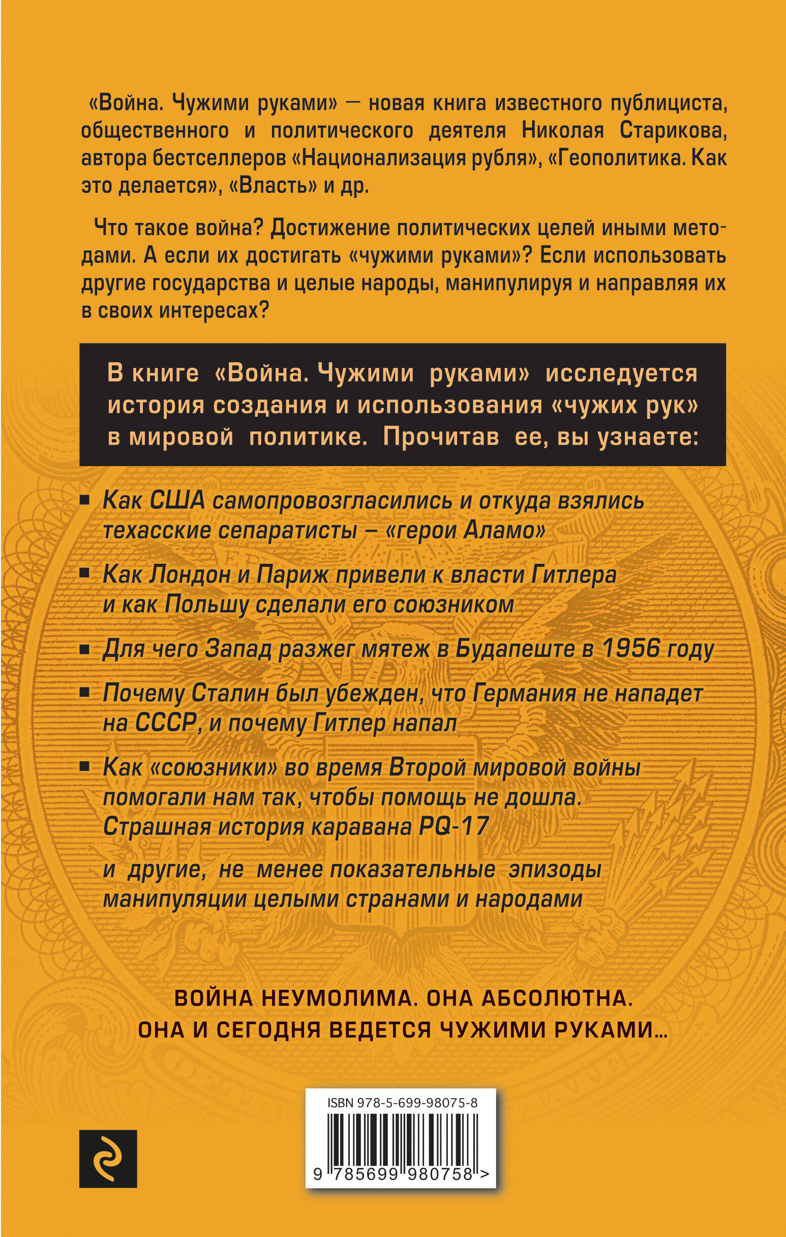 Что такое война? Достижение политических целей иными методами. А если их достигать «чужими руками»? Если использовать другие государства и целые народы, манипулируя и направляя их в своих интересах? Возможно ли вести войну без самих военных действий? Мировая история не раз показала, что можно. В увлекательной и неподражаемой манере публицист Николай Стариков описывает, какие из событий современной истории творились «чужими руками»: - Как самопровозгласились США и откуда взялись техасские сепаратисты - «герои Аламо». - Как Лондон и Париж привели к власти Гитлера и как Польшу сделали его союзником. - Для чего Запад разжег мятеж в Будапеште в 1956 году. - Почему Сталин был убежден, что Германия не нападет на СССР, и почему Гитлер напал. - Как «союзники» во время Второй мировой войны помогали нам так, чтобы помощь не дошла. Страшная история каравана PQ-17. И другие не менее показательные эпизоды манипуляции целыми странами и народами. Масштабный взгляд на тайные политические игры и манипулирование общественным сознанием. Причины и следствия закулисных игр политиков. Книга не менее сокрушительная, чем правда, написанная в ней. Война неумолима. Она абсолютна. Она и сегодня ведется чужими руками…| Издательство | ООО "Издательство "Эксмо" |