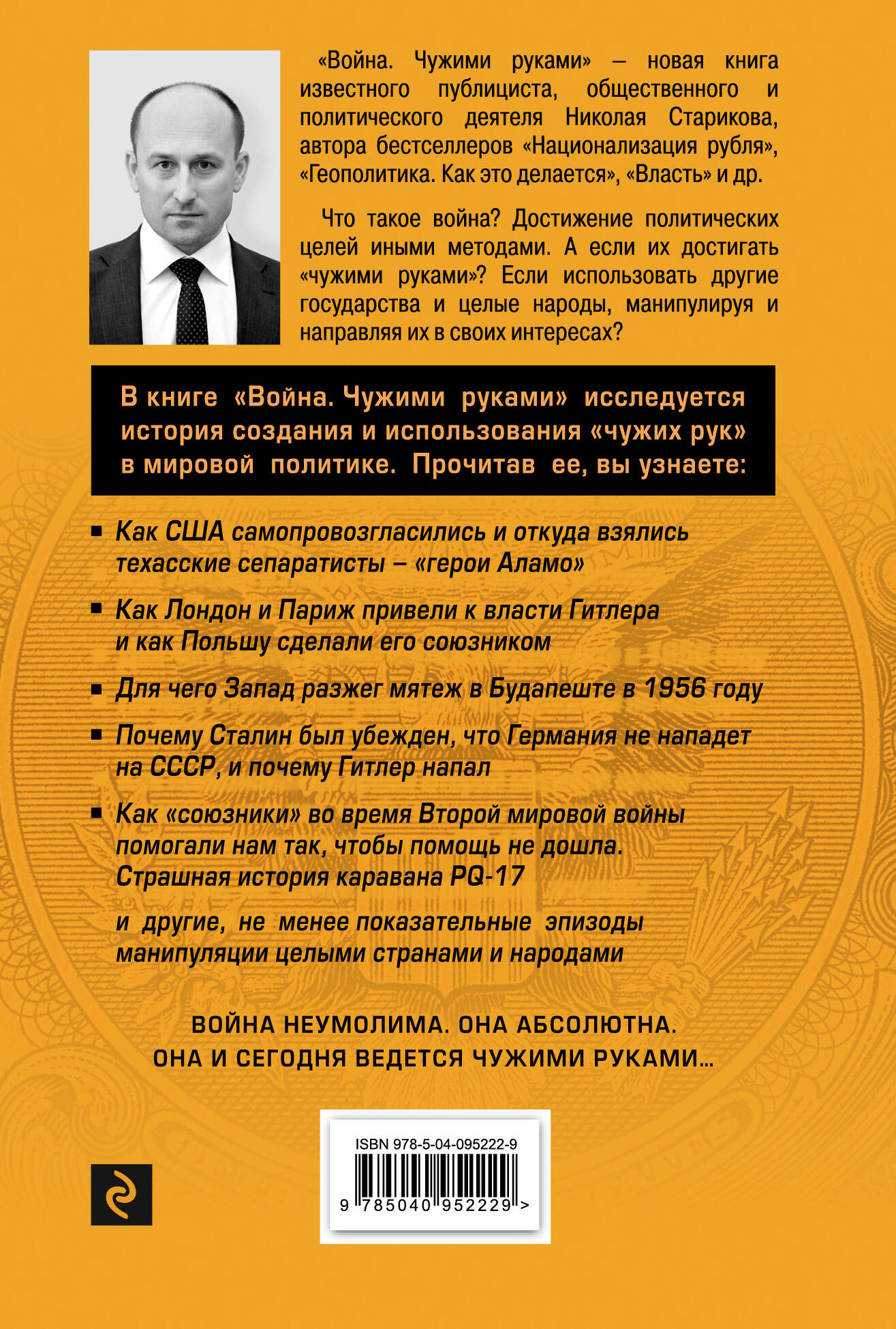 Что такое война? Достижение политических целей иными методами. А если их достигать «чужими руками»? Если использовать другие государства и целые народы, манипулируя и направляя их в своих интересах? Возможно ли вести войну без самих военных действий? Мировая история не раз показала, что можно. В увлекательной и неподражаемой манере публицист Николай Стариков описывает, какие из событий современной истории творились «чужими руками»: - Как самопровозгласились США, и откуда взялись техасские сепаратисты - «герои Аламо». - Как Лондон и Париж привели к власти Гитлера и как Польшу сделали его союзником. - Для чего Запад разжег мятеж в Будапеште в 1956 году. - Почему Сталин был убежден, что Германия не нападет на СССР, и почему Гитлер напал. - Как «союзники» во время Второй мировой войны помогали нам так, чтобы помощь не дошла. Страшная история каравана PQ-17. И другие не менее показательные эпизоды манипуляции целыми странами и народами. Масштабный взгляд на тайные политические игры и манипулирование общественным сознанием. Причины и следствия закулисных игр политиков. Книга не менее сокрушительная, чем правда, написанная в ней. Война неумолима. Она абсолютна. Она и сегодня ведется чужими руками…| Издательство | ООО "Издательство "Эксмо" |