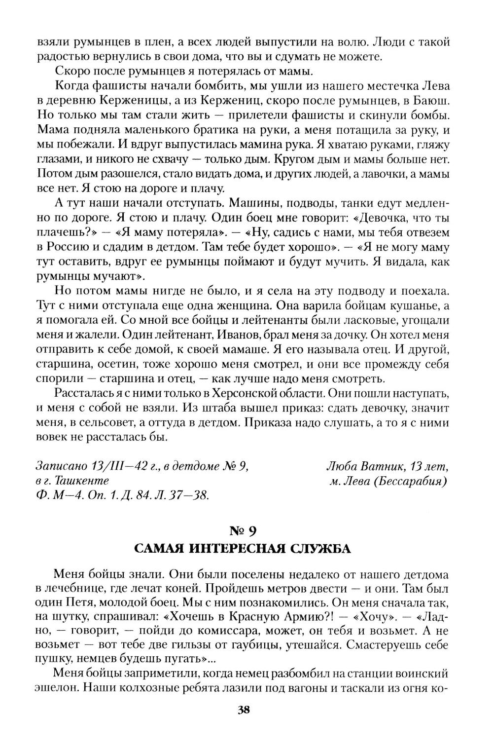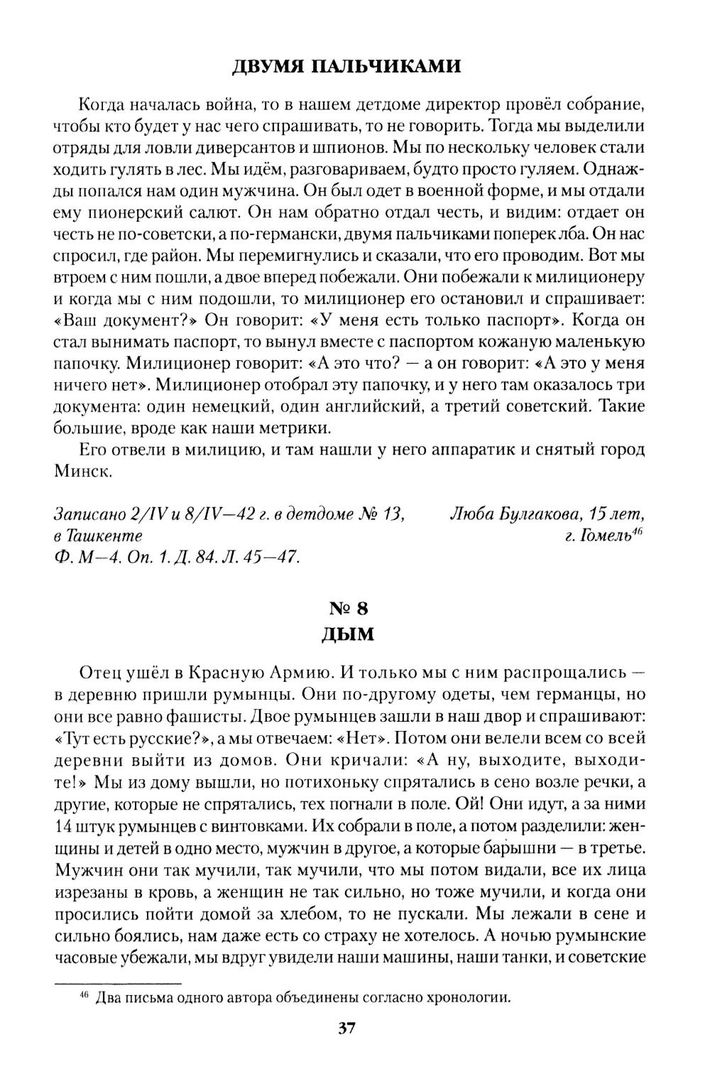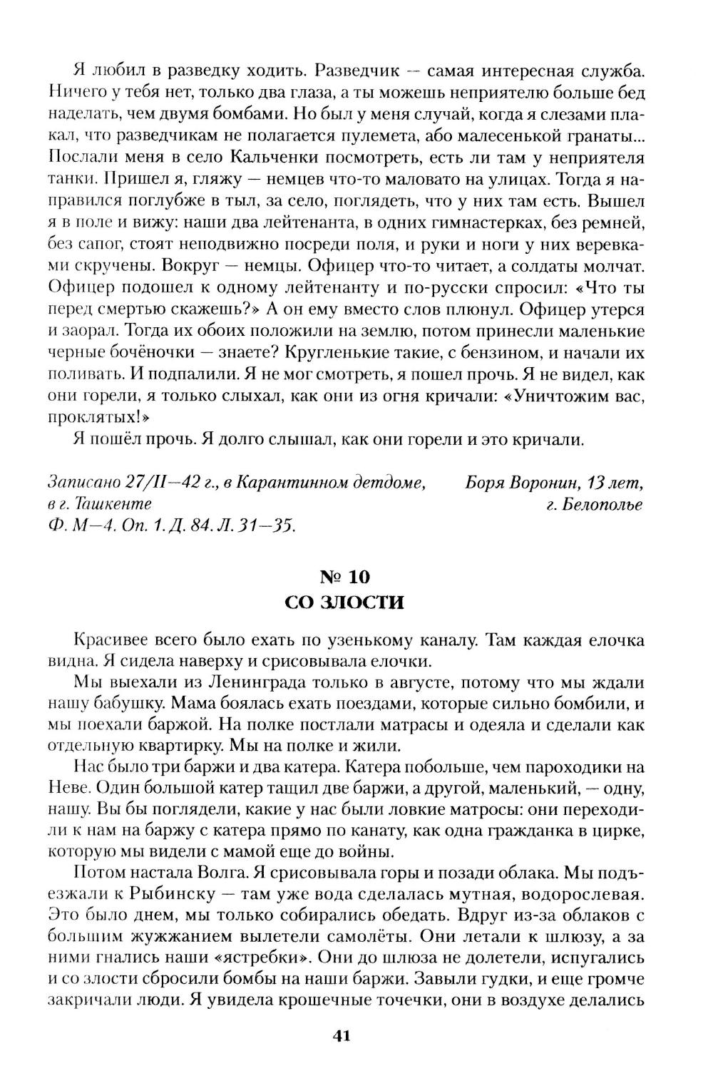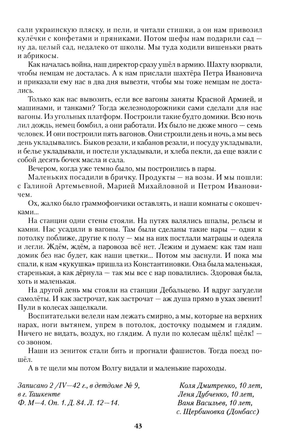 «Дети - это завтрашние судьи наши, это критики наших воззрений, деяний, это люди, которые идут в мир на великую работу строительства новых форм жизни ... их отношение друг к другу, к человеку, миру складываются во время войны, когда одни дети играют с трупами, другие вместе с взрослыми принимают непосредственное участие в войне... и мне кажется, что нам, взрослым, следует знать, как мыслят дети о войне». Это высказывание А.М. Горького может стать эпиграфом к настоящему сборнику, в котором собраны свидетельства детей, переживших тяжелейшие испытания Великой Отечественной войны, прошедших через немецкую оккупацию и концлагеря, воевавших в партизанских отрядах и в действующих войсках, работавших в колхозах, на заводах и фабриках.| Издательство | Вече |