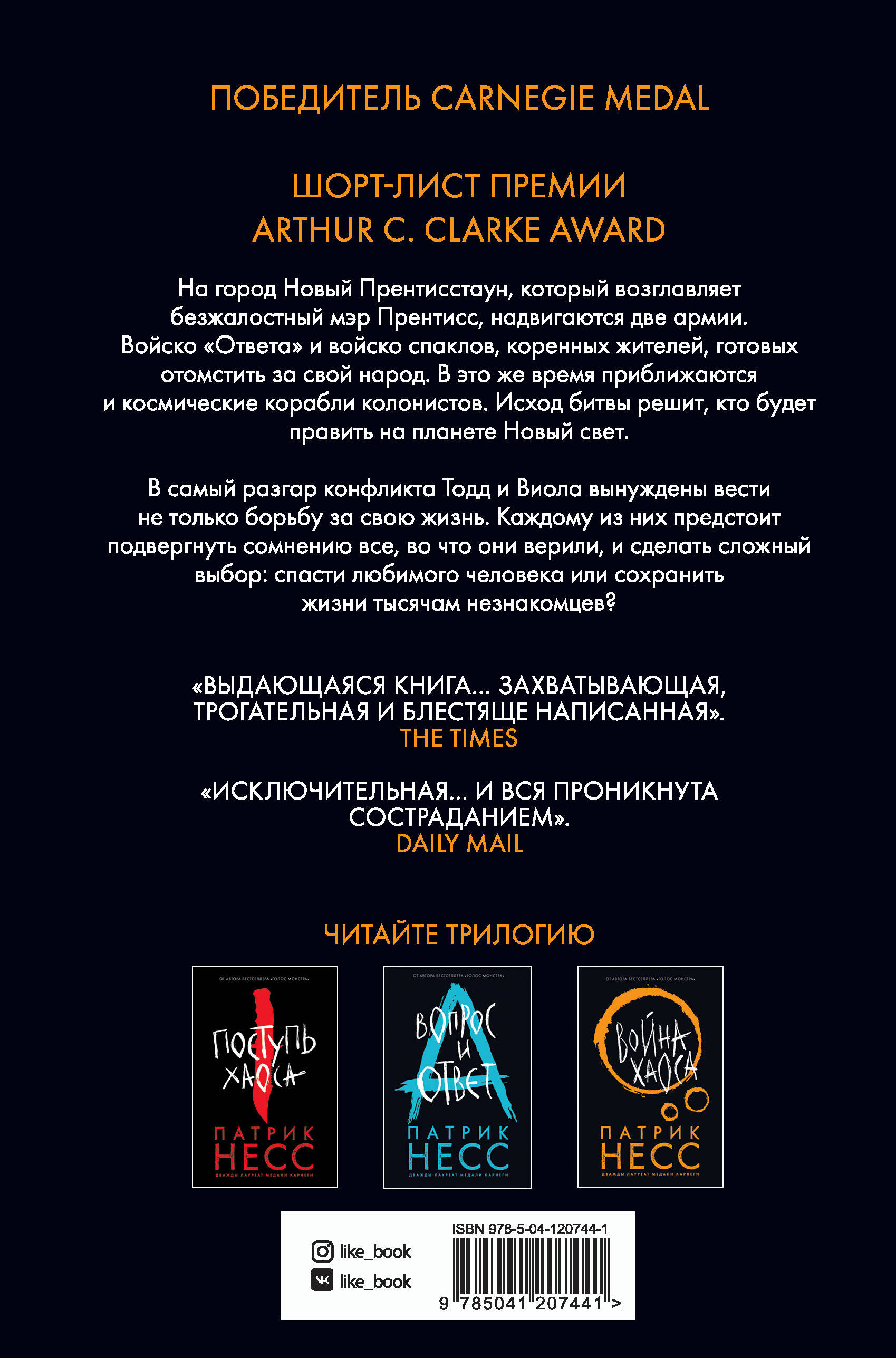 На город Новый Прентисстаун, который возглавляет безжалостный мэр Прентисс, надвигаются две армии. Войско «Ответа» и войско спаклов, коренных жителей, готовых отомстить за свой народ. В это же время приближаются и космические корабли колонистов. Исход битвы решит, кто будет править на планете Новый свет. В самый разгар конфликта Тодд и Виола вынуждены вести не только борьбу за свою жизнь. Каждому из них предстоит подвергнуть сомнению все, во что они верили, и сделать сложный выбор: спасти любимого человека или сохранить жизни тысяч незнакомцев? «Война хаоса» - заключительная часть трилогии. Тодду и Виоле предстоит сделать сложный выбор в мире, где люди превратились в истерзанных войной монстров. Мировой бестселлер. Трилогия «Поступь хаоса» переведена на 32 языка мира. Более 116 изданий и переизданий. Новый перевод. Экранизация от студии Lionsgate. В главных ролях Дейзи Ридли («Звездные войны»), Том Холланд («Человек-паук»), Мадс Миккельсен («Ганнибал», «Death Stranding»), Ник Джонас («Jonas Brothers»). Лауреат премии Carnegie Medal. Шорт-лист премии Arthur C. Clarke Award. Об авторе Патрик Несс - знаменитый американский писатель и журналист, автор десяти романов, среди которых бестселлеры «Поступь хаоса», «Больше, чем это» и «Голос монстра», а также спин-оффа «Class» к популярному телесериалу «Доктор Кто». Дважды лауреат медали Карнеги за выдающийся вклад в литературу для молодежи.| Издательство | ООО "Издательство "Эксмо" |