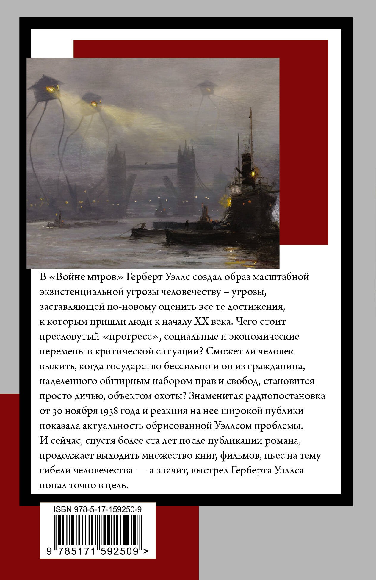 В "Войне миров" Герберт Уэллс создал образ масштабной экзистенциальной угрозы человечеству - угрозы, заставляющей по-новому оценить все те достижения, к которым пришли люди к началу ХХ века. Чего стоит пресловутый "прогресс", социальные и экономические перемены в критической ситуации? Сможет ли человек выжить, когда государство бессильно и он из гражданина, наделенного обширным набором прав и свобод, становится просто дичью, объектом охоты? Знаменитая радиопостановка от 30 ноября 1938 года и реакция на нее широкой публики показала актуальность обрисованной Уэллсом проблемы. И сейчас, спустя более ста лет после публикации романа, продолжает выходить множество книг, фильмов, пьес на тему гибели человечества - а значит, выстрел Герберта Уэллса попал точно в цель.| Издательство | Издательство "АСТ" |