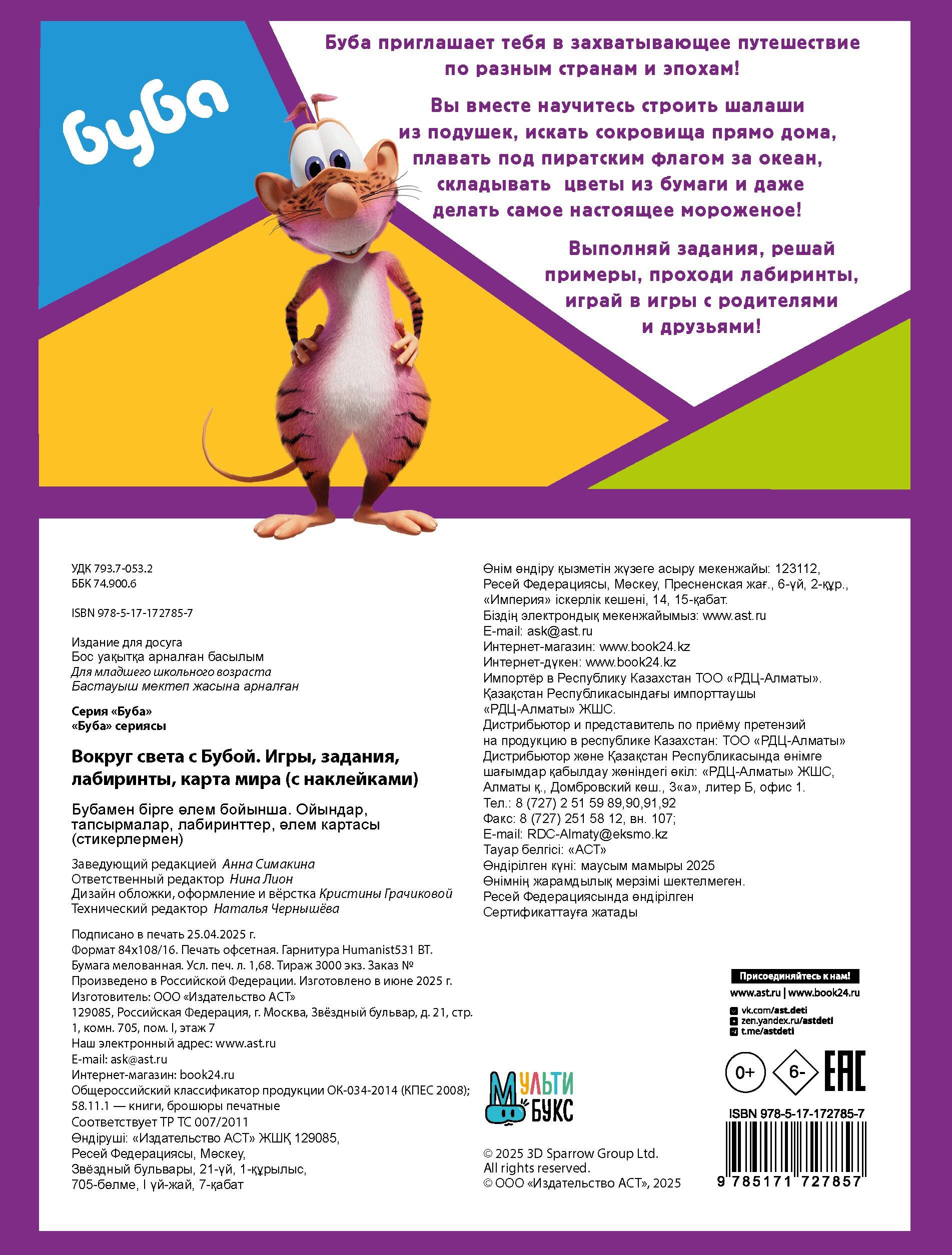 Буба приглашает тебя в захватывающее путешествие по разным странам и эпохам! Вы вместе научитесь строить шалаши из подушек, искать сокровища прямо дома, плавать под пиратским флагом за океан, складывать цветы из бумаги и даже делать самое настоящее мороженое! Выполняй задания, решай примеры, проходи лабиринты, играй в игры с родителями и друзьями! А ещё внутри тебя ждут яркие наклейки и настоящая карта мира!| Издательство | Издательство "АСТ" |