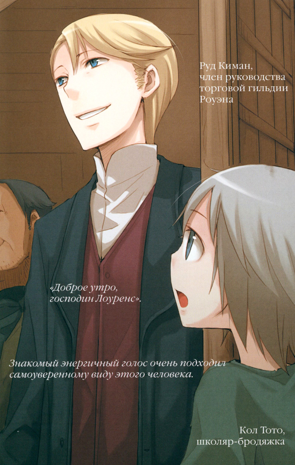 В поисках сведений о волчьей кости Лоуренс и Холо прибывают в портовый город Кэльбе. С рекомендательным письмом от Эйб Лоуренс навещает торговый дом «Джин», связанный с торговым домом Дебау, откуда исходят слухи. Однако Рейнольдз - глава «Джин» - явно считает историю о волчьей кости пустой болтовнёй.