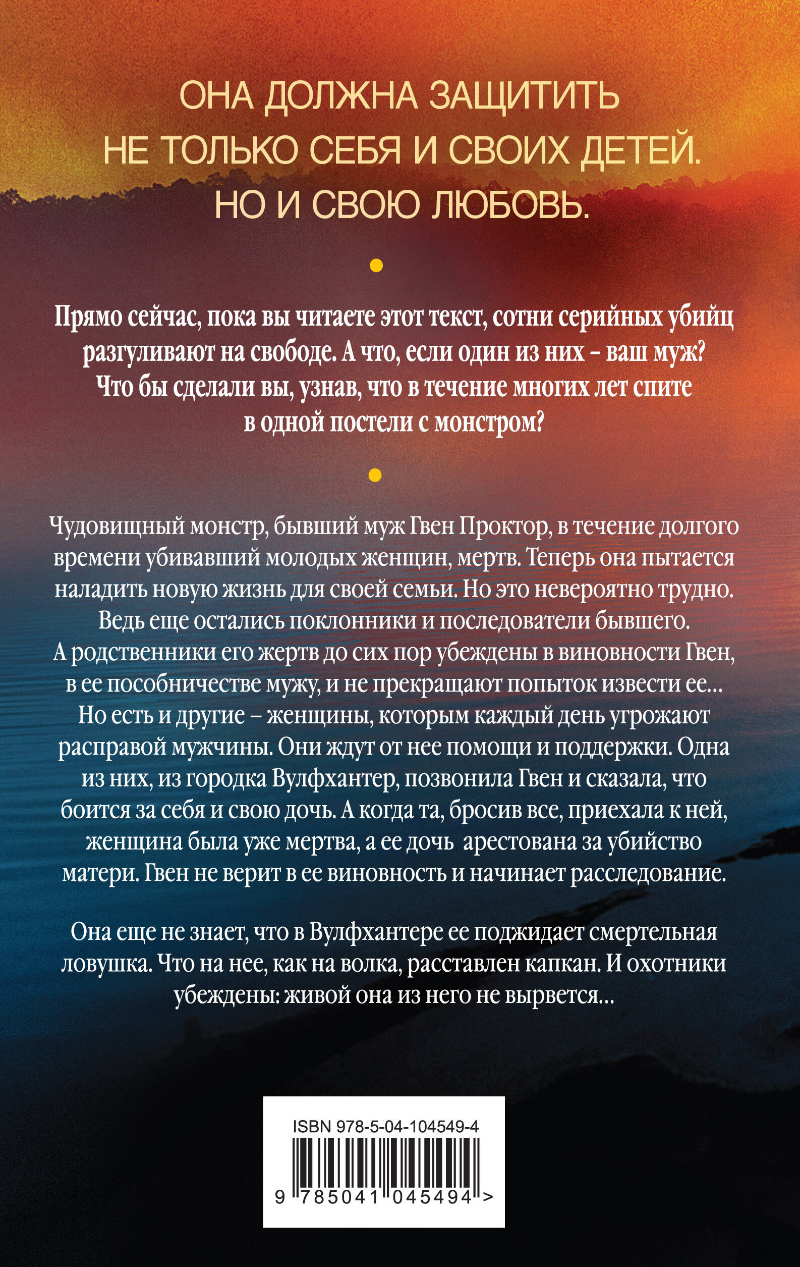 Прямо сейчас, пока вы читаете этот текст, сотни серийных убийц разгуливают на свободе. А что, если один из них - ваш муж? Что бы сделали вы, узнав, что в течение многих лет спите в одной постели с монстром? Чудовищный монстр, бывший муж Гвен Проктор, в течение долгого времени убивавший молодых женщин, - мертв. Теперь она пытается наладить новую жизнь для своей семьи. Но это невероятно трудно. Ведь еще остались поклонники и последователи бывшего. А родственники его жертв до сих пор убеждены в виновности Гвен, в ее пособничестве мужу, и не прекращают попыток извести ее… Но есть и другие - женщины, которым каждый день угрожают расправой мужчины. Они ждут от нее помощи и поддержки. Одна из них, из городка Вулфхантер, позвонила Гвен и сказала, что боится за себя и свою дочь. А когда та, бросив все, приехала к ней, женщина была уже мертва, а ее дочь - арестована за убийство матери. Гвен не верит в ее виновность и начинает собственное расследование. Она еще не знает, что в Вулфхантере ее поджидает смертельная ловушка. Что на нее, как на волка, расставлен капкан. И охотники убеждены: живой она из него не вырвется…| Издательство | Форс Украина ООО |