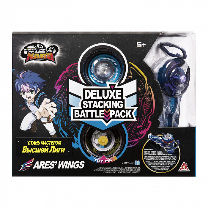 Набор состоит из магнитной пусковой установки с держателем для колец, металлического стакинг-волчка Крылья Ареса, металлического стакинг-кольца, монтажного инструмента. Эти элементы являются взаимозаменяемыми со всеми волчками серии Стакинг.