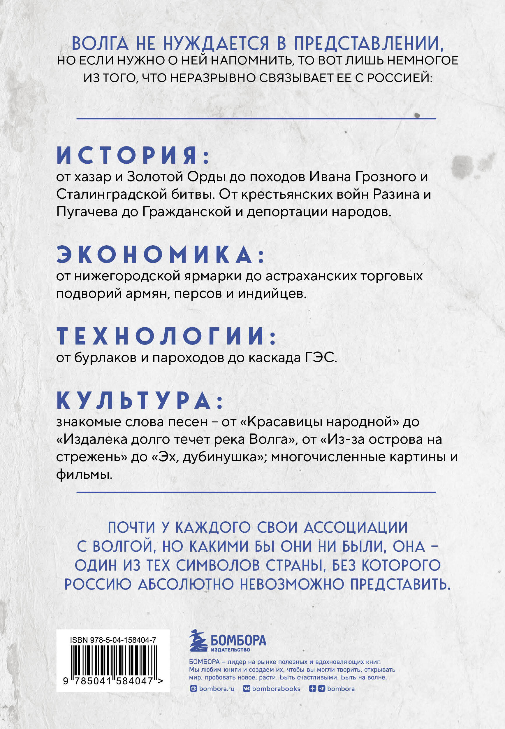 Волга не нуждается в представлении. Но если нужно о ней напомнить, то вот лишь немногое из того, что неразрывно связывает ее с Россией: - История: от хазар и Золотой Орды до походов Ивана Грозного и Сталинградской битвы. От крестьянских войн Разина и Пугачева до Гражданской и депортации народов. - Экономика: от нижегородской ярмарки до астраханских торговых подворий армян, персов и индийцев. - Технологии: от бурлаков и пароходов до каскада ГЭС. Почти у каждого свои ассоциации с Волгой, но какими бы они не были, она - один из тех символов страны, без которого Россию абсолютно невозможно представить.| Издательство | ООО "Издательство "Эксмо" |