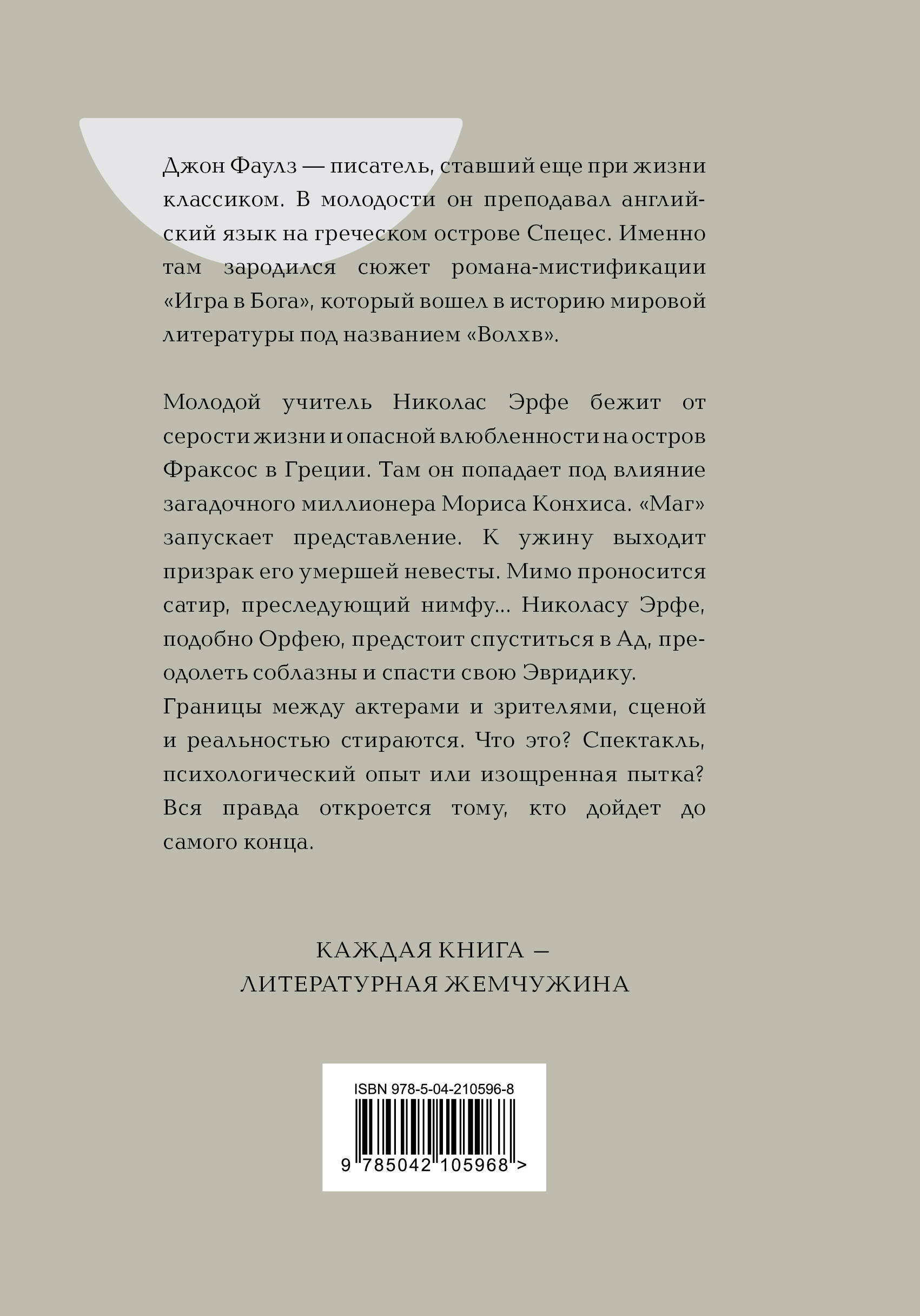 Каждая книга серии - это литературная жемчужина. Джон Фаулз - писатель, ставший еще при жизни классиком. В молодости он преподавал английский язык на греческом острове Спецес. Именно там зародился сюжет романа-мистификации «Игра в Бога», который вошел в историю мировой литературы под названием «Волхв». Молодой учитель Николас Эрфе бежит от серости жизни и опасной влюбленности на остров Фраксос в Греции. Там он попадает под влияние загадочного миллионера Мориса Конхиса. «Маг» запускает представление. К ужину выходит призрак его умершей невесты. Мимо проносится сатир, преследующий нимфу... Николасу Эрфе, подобно Орфею, предстоит спуститься в Ад, преодолеть соблазны и спасти свою Эвридику. Границы между актерами и зрителями, сценой и реальностью стираются. Что это? Спектакль, психологический опыт или изощренная пытка? Вся правда откроется тому, кто дойдет до самого конца. Оформление обложки вдохновлено стилями «тихая роскошь» и «old money». Минималистичная серия «Жемчужина. Классика тихой роскоши» создается как изящное дополнение к культовым образам принцессы Дианы и Жаклин Кеннеди. Эти книги могут довершить стильный образ успешной девушки, а также стать частью интерьера квартиры, ресторана, гостиницы и других пространств. Благодаря металлизированной бумаге создается эффект свечения обложки. Краски мягко и тихо переливаются. На корешке символ книги сделан тиснением серебром, что усиливает эффект внутреннего света. Объемное тиснение фигур создает приятное тактильное ощущение. Текст напечатан на белой бумаге, мягкой на ощупь. Для серии подобран крупный и удобный шрифт, от которого не устанут глаза.| Издательство | ООО "Издательство "Эксмо" |