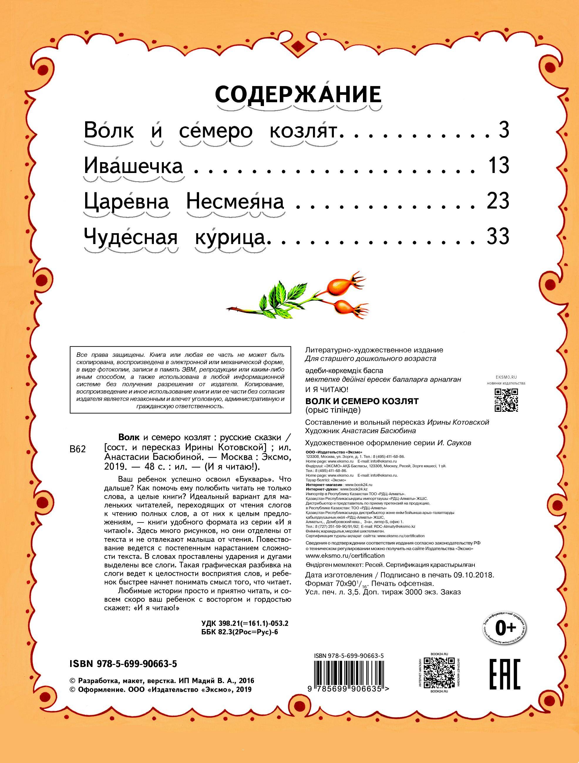 Ваш ребенок успешно освоил «Букварь», что дальше? Как помочь ему полюбить читать не только слова, а целые книги? Идеальный вариант для маленьких читателей, переходящих от чтения слогов к чтению полных слов, а от них к целым предложениям, - книги удобного формата из серии «И я читаю». Здесь много рисунков, но они отделены от текста и не отвлекают малыша от чтения. Повествование ведется с постепенным нарастанием сложности текста. В словах проставлены ударения и дугами выделены все слоги. Такая графическая разбивка на слоги ведет к целостности восприятия слов, и ребенок быстрее начнет понимать смысл того, что читает. Любимые истории просто и приятно читать, и совсем скоро ваш ребенок с восторгом и гордостью скажет: «И я читаю!» В небольшую книгу вошло 4 сказки: «Волк и семеро козлят», «Ивашечка», «Царевна Несмеяна», «Чудесная курица». Чтобы ребенок, успешно освоивший Букварь, легко сделал следующие шаги к чтению с удовольствием, ему на помощь спешат книги из серии «И я читаю!». По своему построению и особенностям каждая книга серии представляет собой тренажер по чтению: • Слова разбиты на слоги, которые выделены дугами, что облегчает чтение. • Повествование ведется с постепенным нарастанием сложности текста. • В словах проставлены ударения. • Книгу удобного формата легко носить с собой. • Красочные картинки даны отдельно, они не отвлекают малыша от чтения. • Любимые сказки: в каждой книге серии их четыре. В серию входят книги со сказками: «Ведьма и Солнцева сестра», «Волшебная дудочка», «Елена Премудрая», «Крошечка-Хаврошечка», «Лиса и журавль», «Поди туда - не знаю куда», «Сивка-Бурка», «Скатерть-самобранка».| Издательство | ООО "Издательство "Эксмо" |