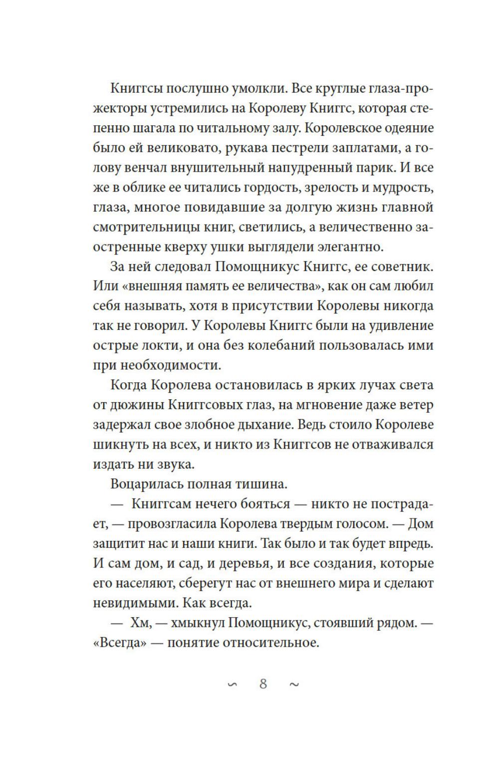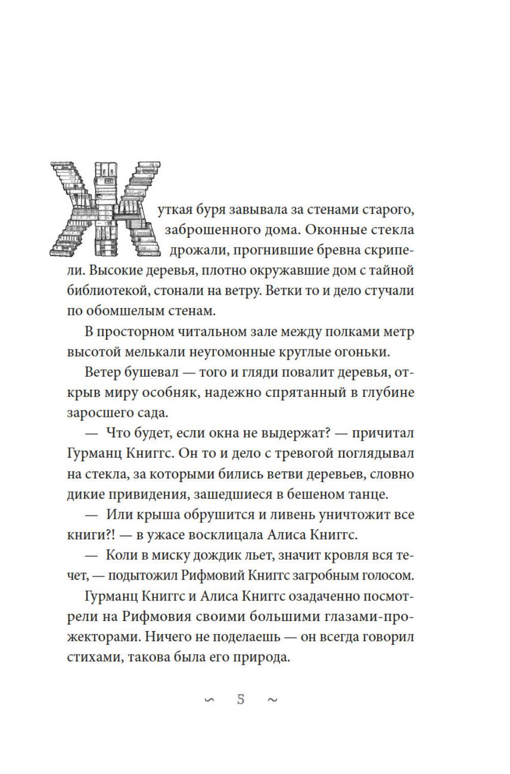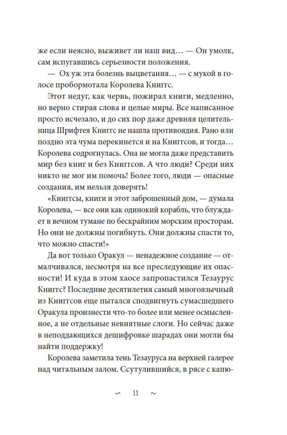 В старом особняке, вдали от людей, живут Книггсы. Дух -хранители книг сберегают в своей библиотеке издания, которых больше не найти в обычном мире. Однако этим книгам грозит опасность. Неизлечимая болезнь выцветания вот-вот сотрет из них тексты. Когда Безумный Оракул предсказывает, что спасение принесут человеческие дети, Книггсы не верят своим ушам. Но вскоре в волшебной библиотеке появляются друзья - Финн, Нола, Мира и Томми. Так размеренная жизнь Книггсов подходит к концу, и начинаются приключения! Нина Георге - немецкий автор и президент Европейского совета писателей. Ее роман «Лавандовая комната» был переведен на 36 языков и возглавил списки бестселлеров по всему миру. Серию «Волшебная библиотека Книггсов» она пишет в соавторстве со своим супругом писателем Йенсом Й. Крамером.| Издательство | Азбука |