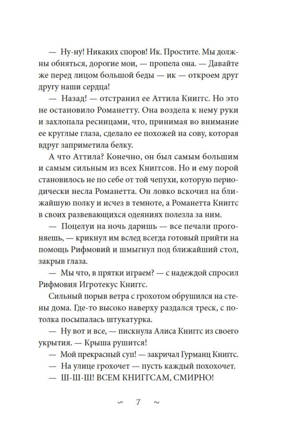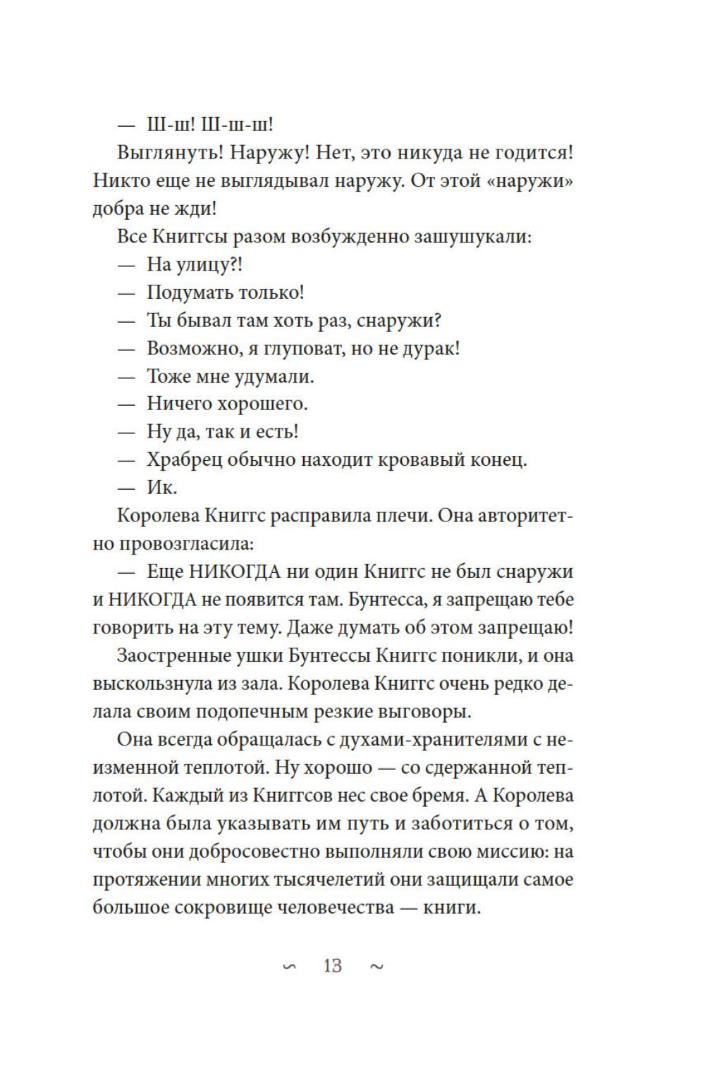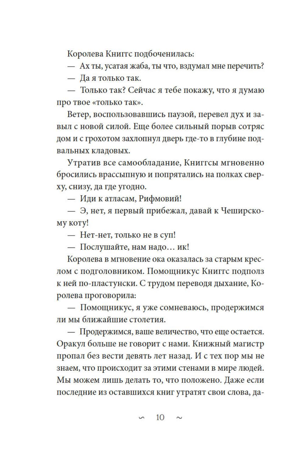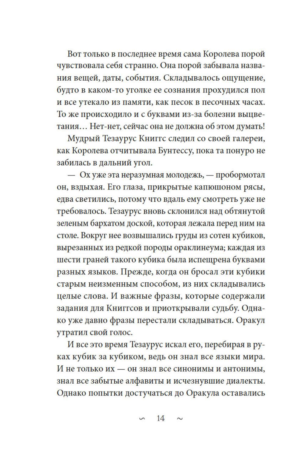 В старом особняке, вдали от людей, живут Книггсы. Дух -хранители книг сберегают в своей библиотеке издания, которых больше не найти в обычном мире. Однако этим книгам грозит опасность. Неизлечимая болезнь выцветания вот-вот сотрет из них тексты. Когда Безумный Оракул предсказывает, что спасение принесут человеческие дети, Книггсы не верят своим ушам. Но вскоре в волшебной библиотеке появляются друзья - Финн, Нола, Мира и Томми. Так размеренная жизнь Книггсов подходит к концу, и начинаются приключения! Нина Георге - немецкий автор и президент Европейского совета писателей. Ее роман «Лавандовая комната» был переведен на 36 языков и возглавил списки бестселлеров по всему миру. Серию «Волшебная библиотека Книггсов» она пишет в соавторстве со своим супругом писателем Йенсом Й. Крамером.| Издательство | Азбука |