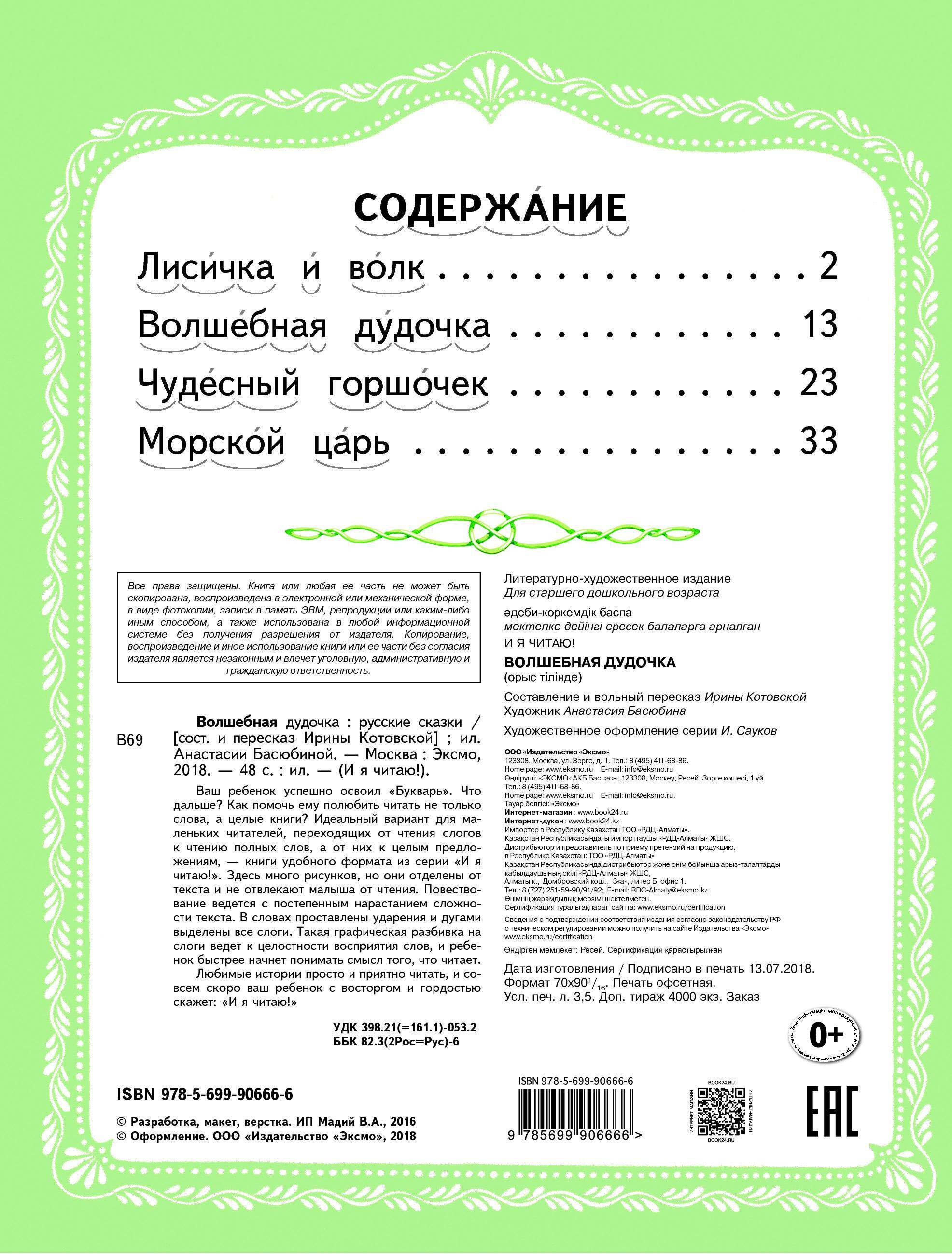 Ваш ребенок успешно освоил «Букварь», что дальше? Как помочь ему полюбить читать не только слова, а целые книги? Идеальный вариант для маленьких читателей, переходящих от чтения слогов к чтению полных слов, а от них к целым предложениям, - книги удобного формата из серии «И я читаю». Здесь много рисунков, но они отделены от текста и не отвлекают малыша от чтения. Повествование ведется с постепенным нарастанием сложности текста. В словах проставлены ударения и дугами выделены все слоги. Такая графическая разбивка на слоги ведет к целостности восприятия слов, и ребенок быстрее начнет понимать смысл того, что читает. Любимые истории просто и приятно читать, и совсем скоро ваш ребенок с восторгом и гордостью скажет: «И я читаю!» В небольшую книгу вошли 4 сказки: «Лисичка и волк», «Волшебная дудочка», «Чудесный горшочек», «Морской царь». Чтобы ребенок, успешно освоивший Букварь, легко сделал следующие шаги к чтению с удовольствием, ему на помощь спешат книги из серии «И я читаю!». По своему построению и особенностям каждая книга серии представляет собой тренажер по чтению: • Слова разбиты на слоги, которые выделены дугами, что облегчает чтение. • Повествование ведется с постепенным нарастанием сложности текста. • В словах проставлены ударения. • Книгу удобного формата легко носить с собой. • Красочные картинки даны отдельно, они не отвлекают малыша от чтения. • Любимые сказки: в каждой книге серии их четыре. В серию входят книги со сказками: «Ведьма и Солнцева сестра», «Волк и семеро козлят», «Волшебная дудочка», «Елена Премудрая», «Крошечка-Хаврошечка», «Лиса и журавль», «Поди туда - не знаю куда», «Сивка-Бурка», «Скатерть-самобранка».| Издательство | ООО "Издательство "Эксмо" |