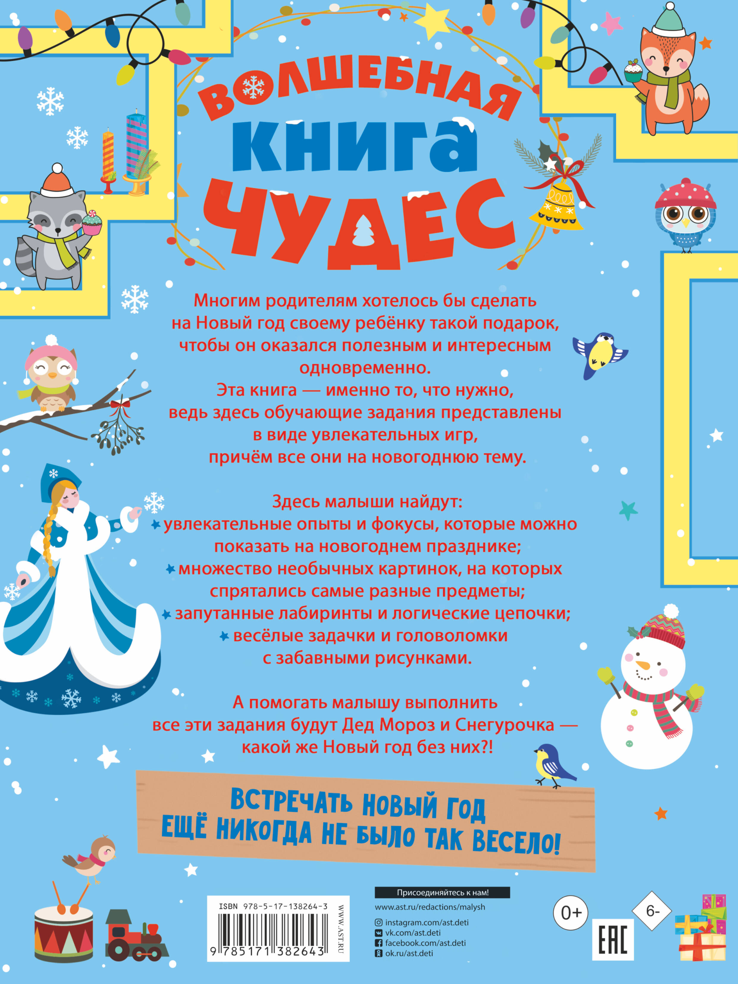 "Волшебная книга чудес" отличается от других книг этой серии, ведь она подготовлена к самому любимому празднику всех детей - Новому году. Малыши по-прежнему будут искать на необычных рисунках самые разные потерявшиеся предметы, находить правильный путь в запутанных лабиринтах, показывать отличия между кажущимися совершенно одинаковыми картинками, проверять свои знания в математике, решая примеры и головоломки, но все задания на страницах этого издания представлены в забавных играх на новогоднюю тему. А ещё здесь есть увлекательные опыты и фокусы, которые можно показать на семейном празднике. Таким образом, эта книга позволит детям не только развить свои способности и расширить круг увлечений, но и подготовиться к Новому году. А помогут им в этом, конечно же, Дед Мороз и Снегурочка, ставшие главными героями приведённых в книге упражнений. Встречайте Новый год весело! Для дошкольного возраста.| Издательство | ИЗДАТЕЛЬСТВО "АСТ" |