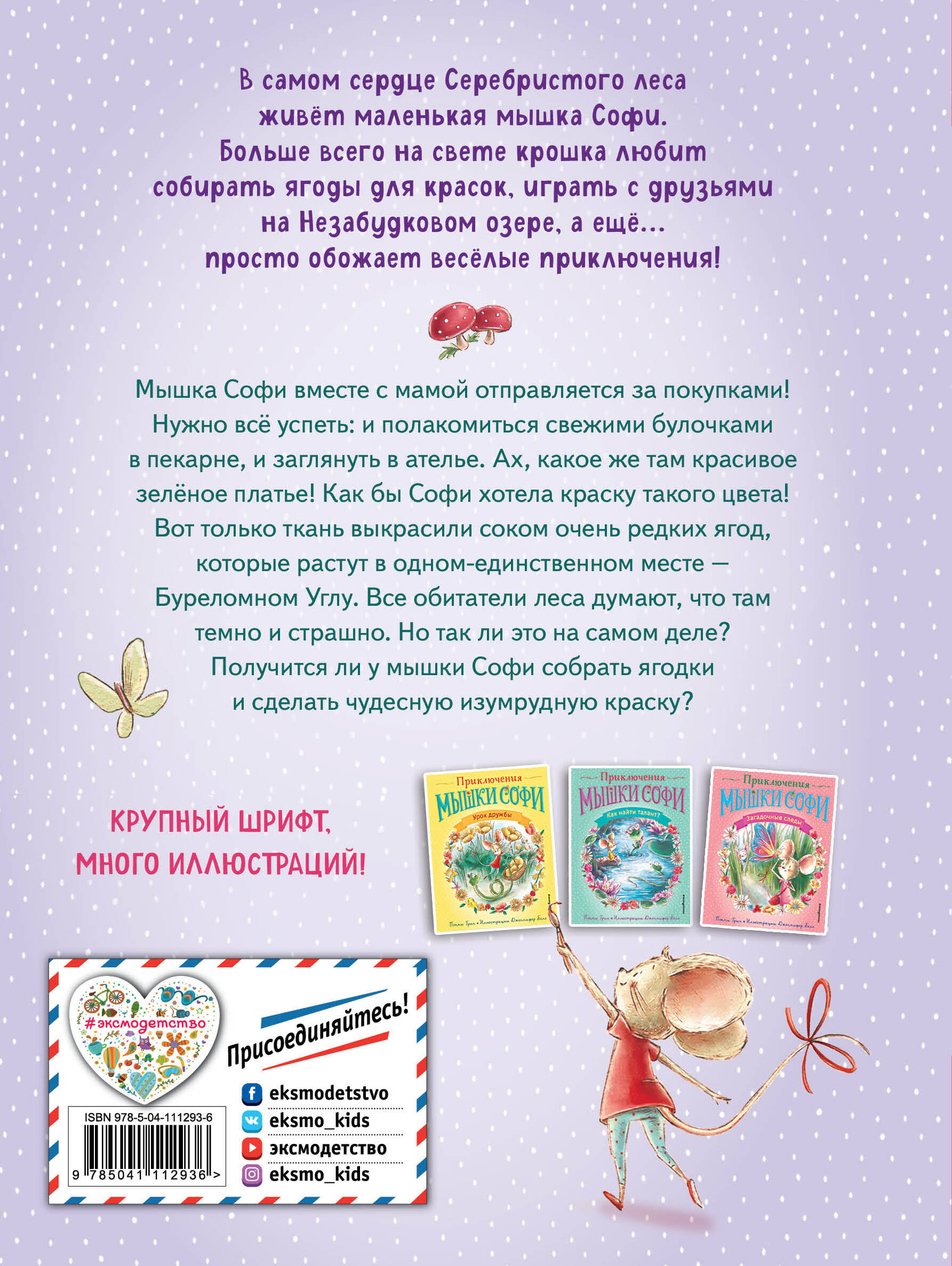 Мышка Софи очень любит ходить с мамой по магазинам! Вот и в этот раз им нужно так много успеть: забежать на почту, полакомиться горячими булочками, зайти в ателье. Именно там Софи увидела… чудесное зелёное платье! Как было бы здорово сделать краску для рисования такого цвета! Только вот изумрудную краску можно получить из ягод, которые растут в Буреломном Углу. А все зверята думают, что там страшно и темно! Но так ли это на самом деле? Получится ли у мышки собрать необычные ягодки и сделать краску? Замечательная история о преодолении собственных страхов идеально подойдёт для начинающих читателей. Книги о приключениях мышки Софи и её друзей прекрасно развивают воображение. Читать будет удобно: крупный шрифт, небольшие главы. Кроме того, истории дополнены милыми иллюстрациями Дженнифер Белл, которая оформила более сорока детских книг!| Издательство | ООО "Издательство "Эксмо" |