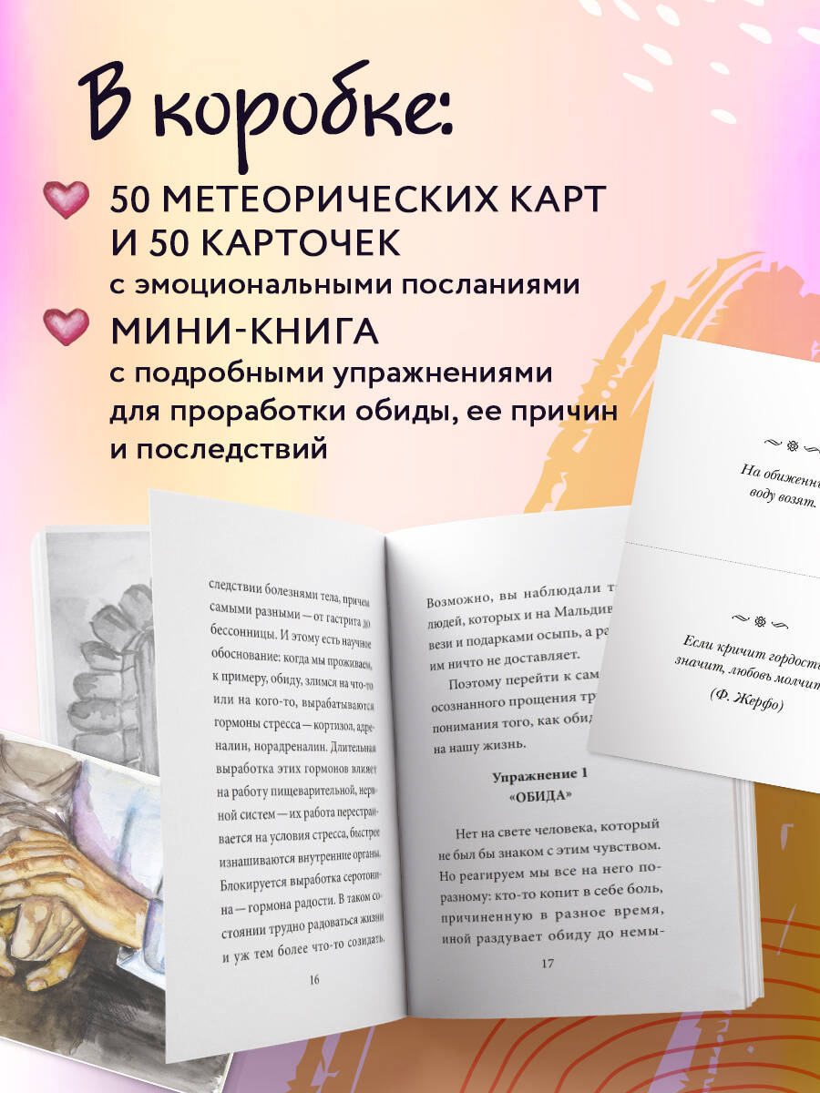 50 метафорических картин и 50 карточек с эмоциональными подсказками от психолога Анны Гращенковой помогут тебе простить и отпустить обиду раз и навсегда. Колода снабжена мини-книгой, в которой подробнейшим образом описаны упражнения, направленные на работу с обидой, ее причинами, последствиями, а также на то, чтобы научиться прощать по-настоящему, от всего сердца. Ресурсные, трансформационные и освобождающие метафорические карты «Волшебная сила прощения» будут полезны психологам, психотерапевтам, людям, которым интересны психология и самопознание, тем, кто хочет распрощаться с обидами и ощутить радость и легкость прощения. Подумай, что тебе важнее: быть правым или счастливым? И отправляйся в путешествие по тайнам своего подсознания. Колода выполнена на великолепном мелованном картоне и запакована в коробочку со специально подобранным набором цветов для обретения нового вкуса к жизни. Без горечи и неприятного осадка. «Для тех, кто хочет научиться прощать. Искренне, открыто, честно - по-настоящему. Эта колода карт поможет начать лучше понимать себя и свои чувства в определенных аспектах. Избавление от обид и ощущение легкости от самого настоящего внутреннего очищения - вот что оставляет она после себя». - Смирнова Татьяна Александровна, нейробиолог, андрагог, автор нескольких образовательных проектов| Издательство | ООО "Издательство "Эксмо" |