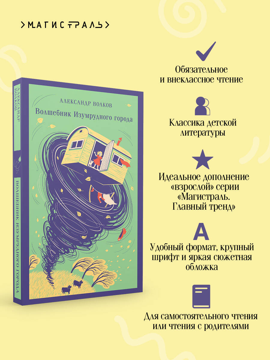 О книге: "Волшебник Изумрудного города" - это литературная адаптация Александра Волкова знаменитой сказки Л. Ф. Баума "Мудрец из Страны Оз". Повесть рассказывает о приключениях девочки Элли и ее собачки Тотошки, которых ураган уносит в волшебную страну. Уносит вместе с домом и обрушивает этот дом на злую волшебницу, Гингему. Элли и Тотошка очень хотят вернуться домой, в Канзас. Элли и Тотошка знакомяться со Страшилой, Железным Дровосеком и Львом. Все вместе они отправляются в Изумрудный город к великому и ужасному Гудвину. Скорее всего, вы смотрели знаменитые мультфильмы и многочисленные экранизации про Изумрудный город. Но в книге Александра Волкова столько деталей и диалогов, не вошедших в видеоконтент: как Тотошка дружил со Львом и спал с ним в одной клетке, как Элли не отчаивалась каждый раз, когда ей никто не мог помочь вернуться домой. Александр Волков пишет на языке понятном для детей и взрослых. Прекрасная книга для чтения и обсуждения в кругу семьи. О серии: «Магистраль. Дети» - яркая, удобная серия книг для детей, а также их родителей и учителей. Книги из этой серии можно читать где угодно: в школе, дома, в дороге или на даче. Они легкие и прочные. Сюжетные черно-белые картиночки почти на каждой странице и цветные иллюстрации на вкладках удачно дополняют издание. В серии собраны только лучшие и проверенные временем произведения.| Издательство | ООО "Издательство "Эксмо" |