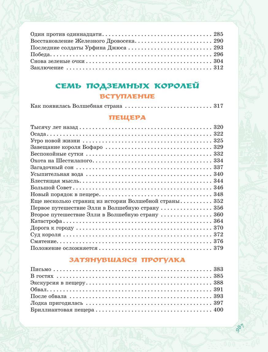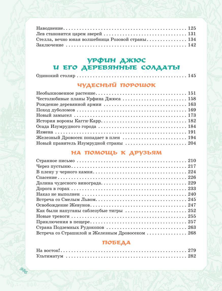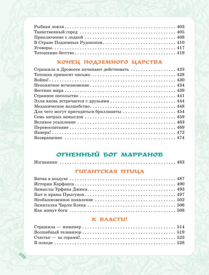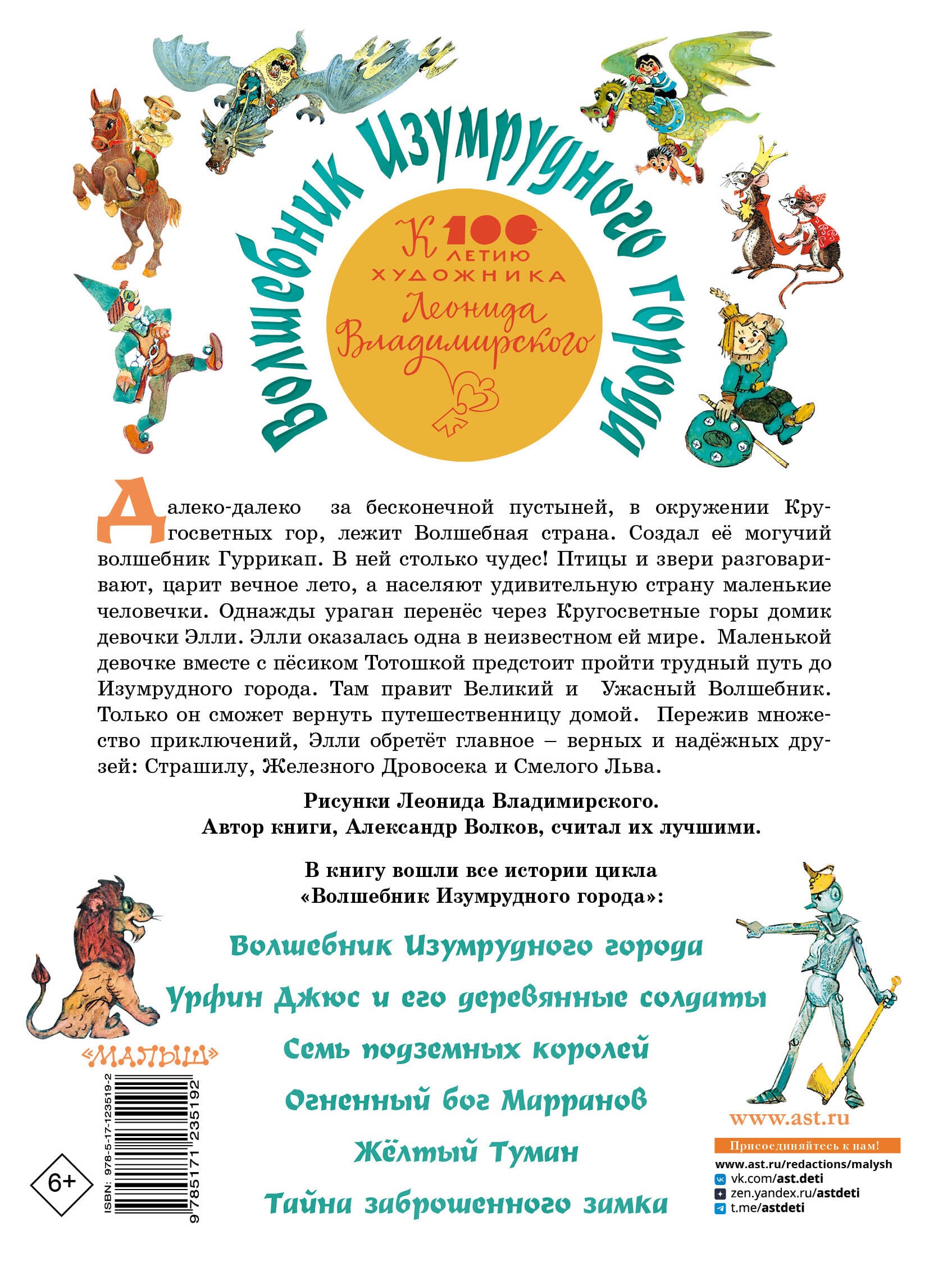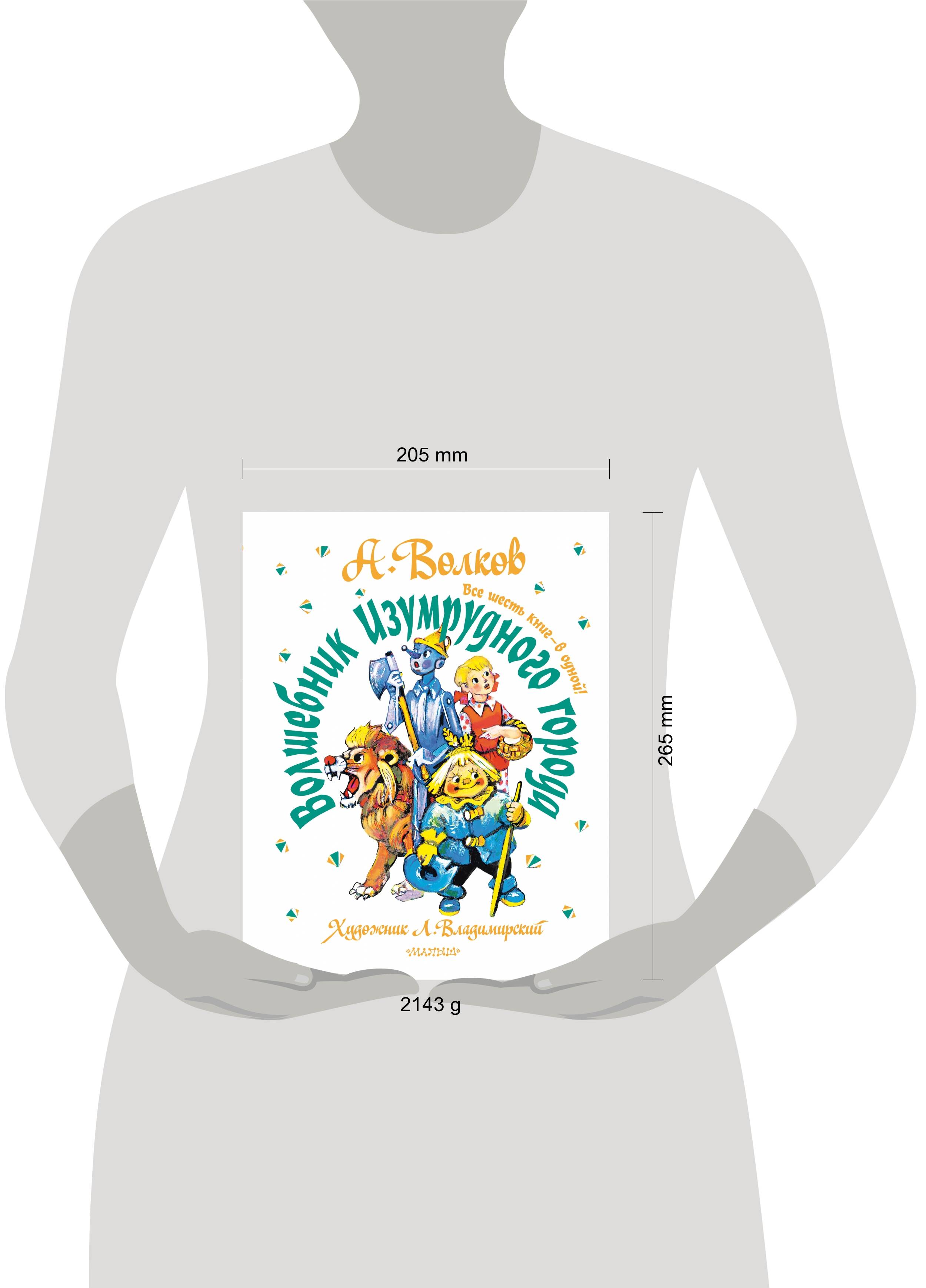 Далеко-далеко за бесконечной пустыней, в окружении Кругосветных гор, лежит Волшебная страна. Создал её могучий волшебник Гуррикап. В ней столько чудес! Птицы и звери разговаривают, царит вечное лето, а населяют удивительную страну маленькие человечки. Однажды ураган перенёс через Кругосветные горы домик девочки Элли. Элли оказалась одна в неизвестном ей мире. Маленькой девочке вместе с пёсиком Тотошкой предстоит пройти трудный путь до Изумрудного города. Там правит Великий и Ужасный Волшебник. Только он сможет вернуть путешественницу домой. Пережив множество приключений, Элли обретёт главное - верных и надёжных друзей: Страшилу, Железного Дровосека и Смелого Льва. Рисунки известного художника Леонида Владимирского. Автор книги, Александр Волков, считал их лучшими. В книгу вошли все истории цикла «Волшебник Изумрудного города»: «Волшебник Изумрудного города», «Урфин Джюс и его деревянные солдаты», «Семь подземных королей», «Огненный бог Марранов», «Жёлтый туман», «Тайна заброшенного замка».| Издательство | ИЗДАТЕЛЬСТВО "АСТ" |