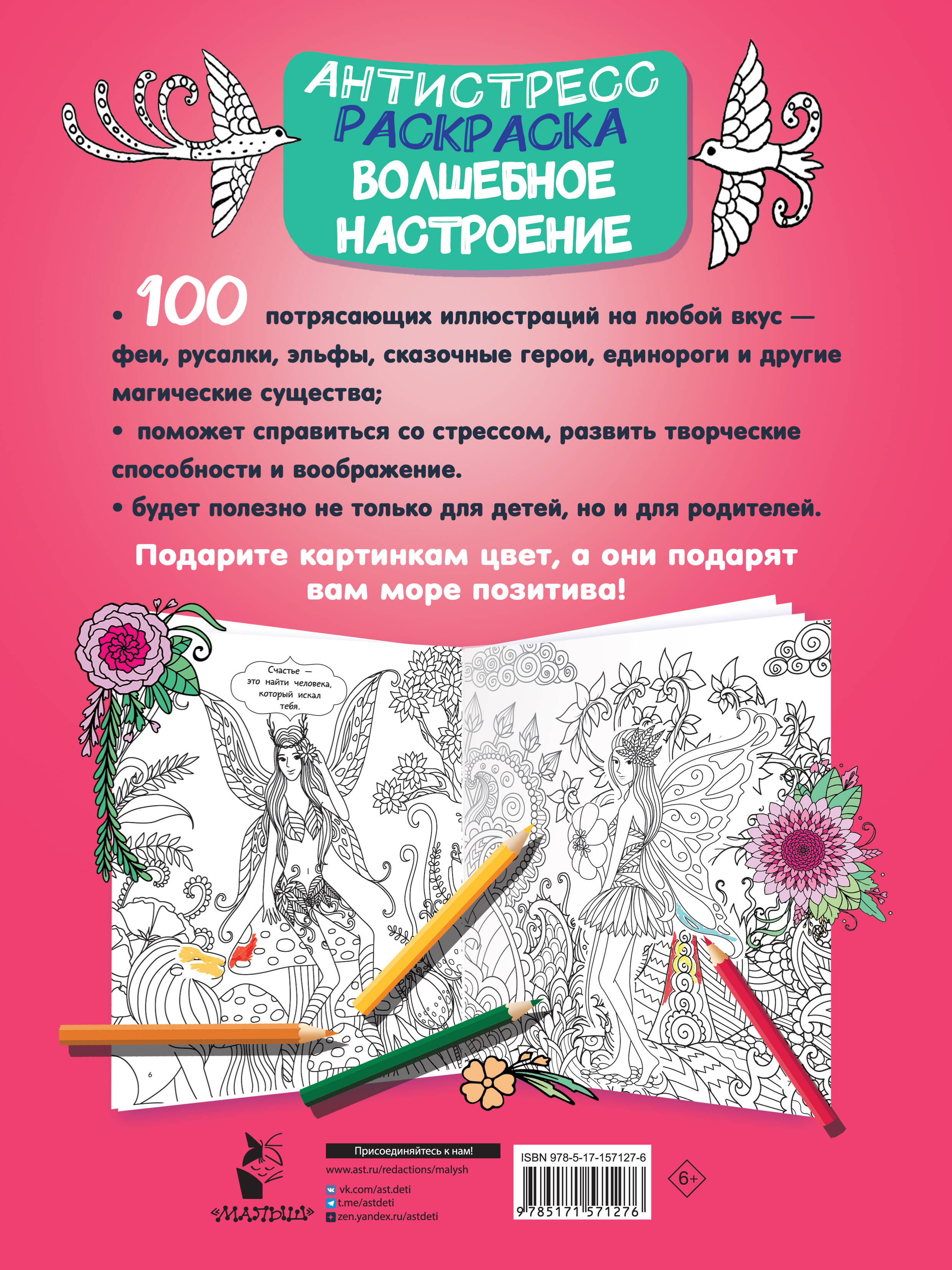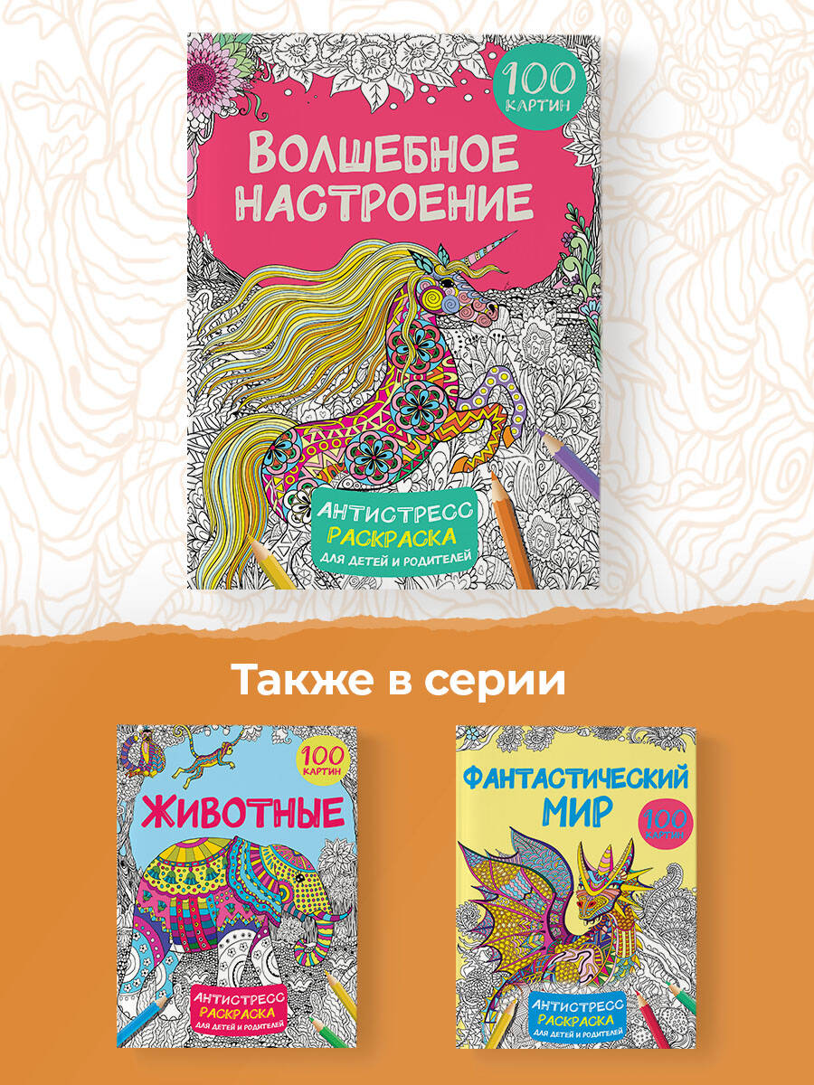 Антистресс-раскраски - один из лучших способов победить стресс и расслабиться после трудного дня. Детям они помогают снизить уровень тревожности, выработать усидчивость и проявить творческие способности. «Волшебное настроение. 100 картинок» - замечательная антистресс-раскраска для поклонников волшебных сказок и фэнтези. На рисунках для расслабляющего отдыха - реальные и выдуманные существа, сказочные персонажи, волшебные узоры и орнаменты. Всего - более 100 картинок с обилием мелких деталей. Работа с мелкими объектами позволяет полностью погрузиться в процесс раскрашивания и отвлечься от дел. Раскраска отлично подойдёт как для детей, так и для их родителей.| Издательство | ИЗДАТЕЛЬСТВО "АСТ" |