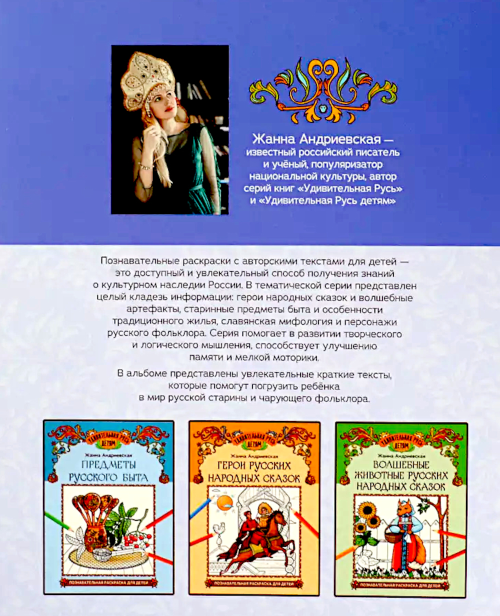 Познавательные раскраски с авторским текстом для детей - это доступный и увлекательный способ получения знаний о культурном наследии России. В тематической серии представлен целый кладезь информации: герои русских народных сказок и волшебные артефакты, старинные предметы быта и особенности традиционного жилья, славянская мифология и персонажи русского фольклора.