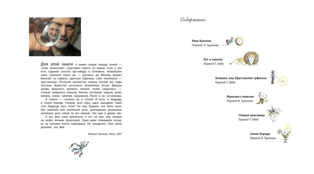 «Золушка» и «Спящая красавица», «Кот в сапогах» и «Мальчик-с-пальчик», «Синяя Борода» и «Рике-Хохлок» - проживают уже четвертое столетие своей литературной жизни. В 1697 году Шарль Перро, поэт и литератор эпохи классицизма, сановник французского двора в царствование Людовика XIV, опубликовал «Сказки матушки Гусыни». И с тех пор уже много поколений эти сказки - самые старые и верные друзья нашего детства. Один из секретов долгой жизни сказок - они вдохновляют людей творить волшебство. Это ведь самая настоящая магия - самим своим существованием вдохновлять художников, поэтов, кинематографистов вновь и вновь воплощать своих героев и злодеев в новых образах, в новых красках, в удивительных картинах. Петербургский художник Михаил Бычков - именно такой волшебник. Этот добрый волшебник всегда очень заботится о своих героях: строит им фантастические замки, шьет удивительные наряды для фей и принцесс, выращивает заколдованные леса и устраивает грандиозные фейерверки по праздникам. Чтобы ты, дорогой читатель, смог воочию представить этот чарующий, полный чудес и превращений, мир, в котором добро неизменно побеждает зло.| Издательство | Азбука |