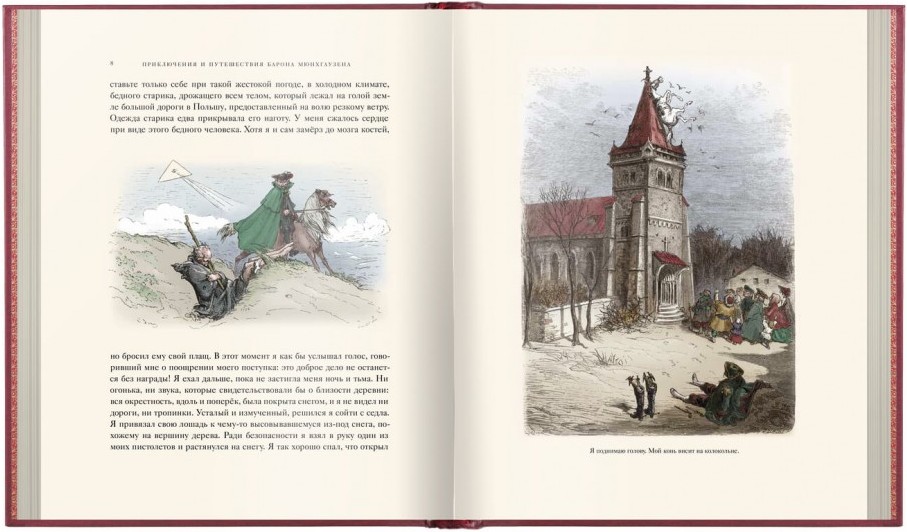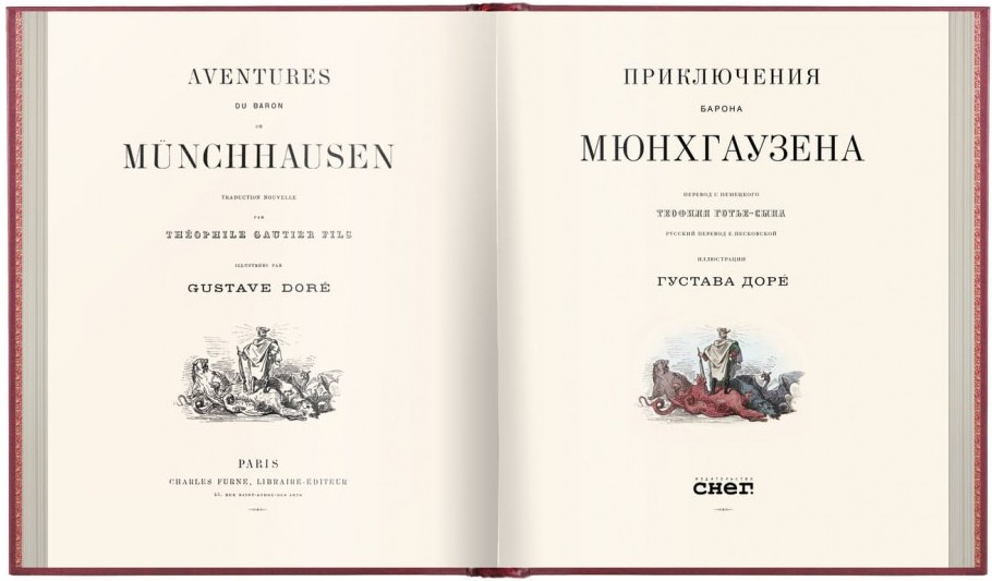 Настоящая книга является новым изданием "Приключений барона Мюнхгаузена". Она печатается по французскому изданию Шарля Фюрна (1794-1859), к которому Гюстав Доре в 1872 году создал цикл иллюстраций, включавший 118 рисунков в тексте и 29 отдельных полосных иллюстраций. Текст приводится в переводе Е.И. Песковской, который она создала для издания М.О. Вольфа, увидевшего свет в 1889 г. и затем неоднократно переизданного. Это наиболее точный перевод произведения Р.Э. Распе и Г.А. Бюргера на русский язык, а значит и наиболее близкий к оригиналу немецкого издания 1786 г. Текст, избавленный от последующих изменений и наслоений XIX-XX веков, и полный комплект иллюстраций Доре делает настоящую книгу новым, наиболее точным и содержательным в современной России изданием "Приключений барона Мюнхгаузена".