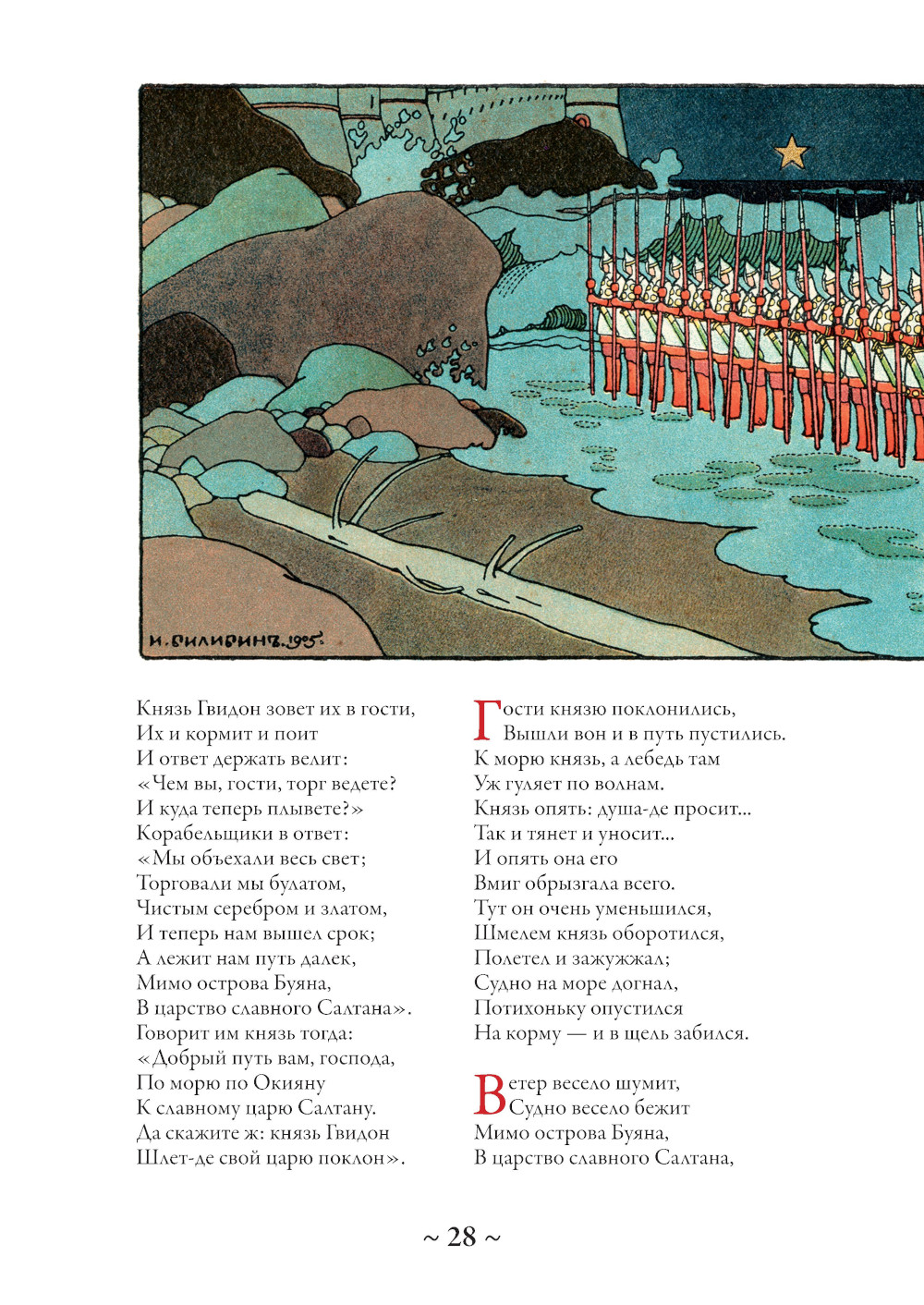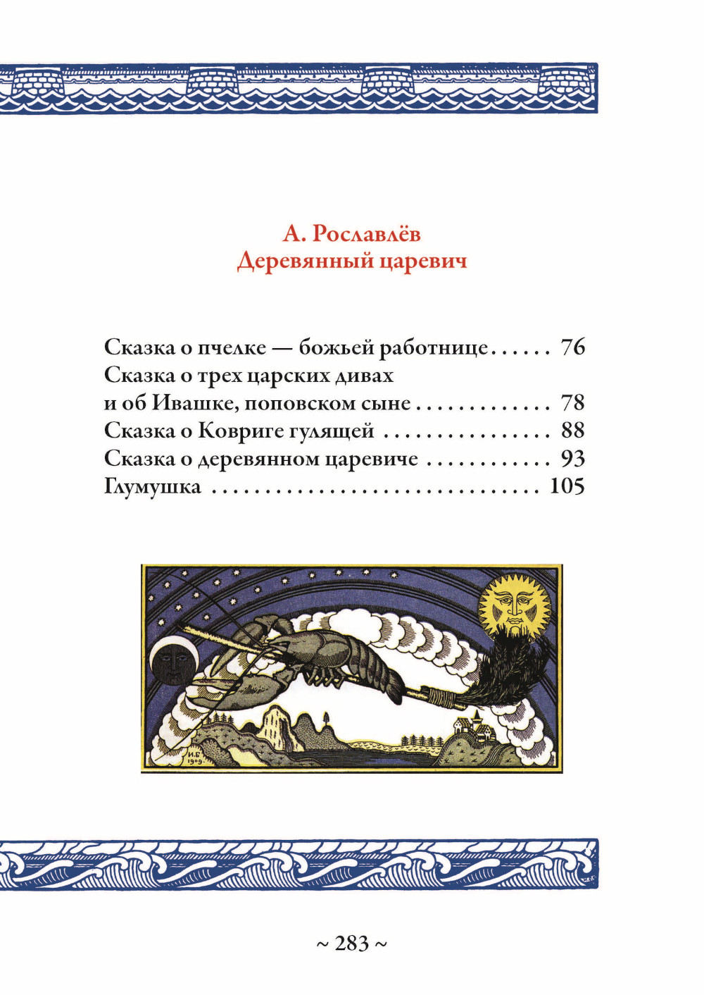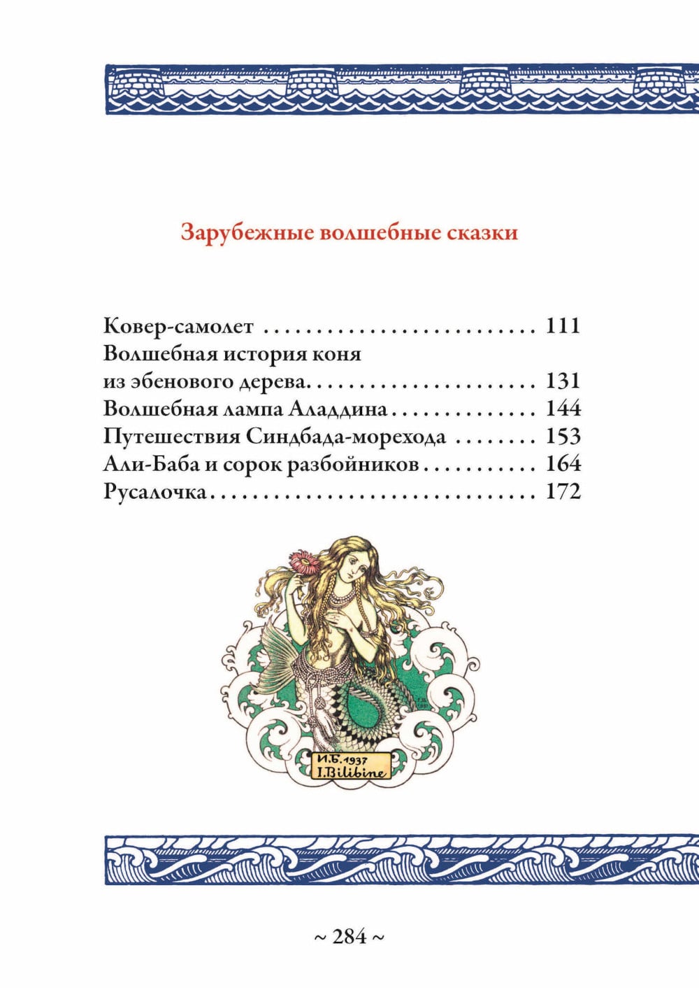 Все сказки в этом сборнике проиллюстрированы признанным виртуозом орнамента и рисунка, прекрасным мастером цвета, великолепным иллюстратором и оформителем книг Иваном Яковлевичем Билибиным. Именно они придают книге уникальный колорит, ведь не будет преувеличением сказать, что удивительный мир русских сказок мы во многом представляем себе именно благодаря удивительным рисункам этого талантливого художника. Будущий классик книжной иллюстрации родился в 1876 году в семье военно-морского врача. Тяга к рисованию проявилась у него еще в детстве, однако отец Билибина был против обучения сына в Академии Художеств. В результате юноша закончил юридический факультет Санкт-Петербургского университета, но увлечение рисованием постоянно уводило Билибина в сторону от юриспруденции. Еще в студенческие годы он начал посещать художественные классы, которыми руководил И. Е. Репин. В конце 1898 года Билибин два месяца проучился в мастерской Антона Ашбе в Мюнхене, а через год, находясь в Тверской губернии, он создал иллюстрации к книге «Сказка о Иван-царевиче, Жар-птице и о Сером волке». Художник был большим поклонником Виктора Васнецова и так же, как и Васнецов, черпал вдохновение в народном творчестве. Используя декоративные приемы древнерусского и народного искусства (вышивки, лубки, иконы), Иван Яковлевич сформировал свой уникальный «билибинский» стиль, который прославил художника. Рисунки Билибина легко узнают даже далекие от искусства люди. Иллюстрации к русским сказкам Билибина заметил князь Б. Б. Голицын, возглавлявший в конце XIX века так называемую «Экспедицию заготовления государственных бумаг». Под ее эгидой Голицын мечтал выпускать высококачественную печатную продукцию, которая способствовала 6ы эстетическому развитию народа. Рисунки Билибина как нельзя лучше соответствовали этой цели. Сотрудничество художника с «Экспедицией» продолжалось несколько лет. По заданию этнографического отдела Музея Александра III Билибин посетил Вологодскую, Олонецкую и Архангельскую губернии, где изучал деревянное зодчество. В начале ХХ века заставки, концовки, обложки и другие работы Билибина стали появляться в таких журналах как «Мир Искусства» и «Золотое Руно». Суровые ветры революции 1917 года заставили Билибина покинуть Россию. Он жил и успешно работал сначала в Каире, потом в Париже. Однако желание вновь оказаться на родине было так велико, что в 1936 году художник переехал в Ленинград. В этом городе он и умер зимой 1942 года от истощения, отказавшись после начала войны от предложенной ему властями эвакуации.| Издательство | СЗКЭО |